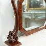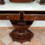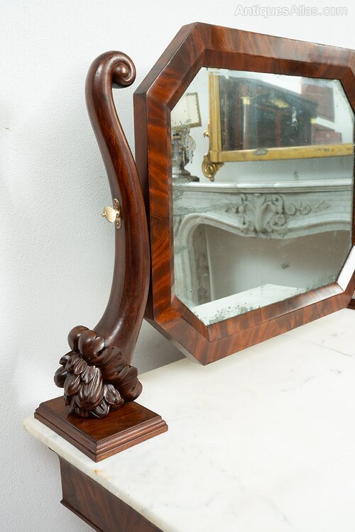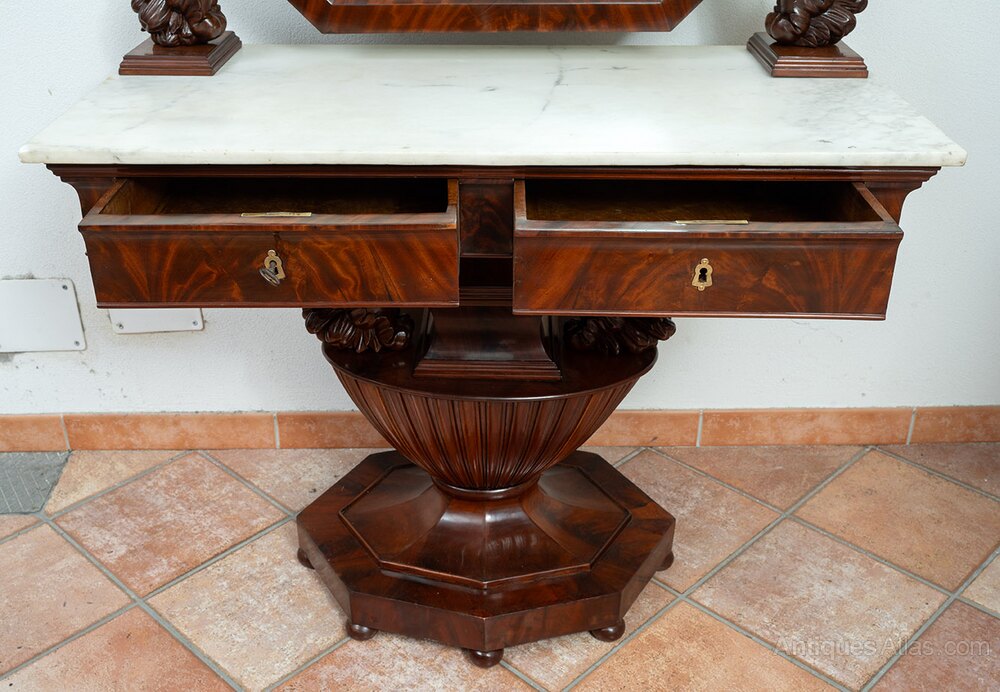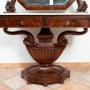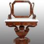 Description: Antique Neapolitan Empire dressing table in mahogany with a marble top, dating back to the early 19th century.The front features an octagonal mirror supported by cornucopia-shaped arms.