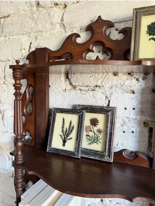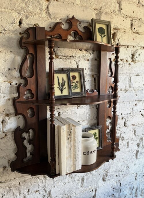 Antique French wall hanging tiered étagère. Delicately constructed mahogany in a rich dark tone in good solid condition with the exception of a small repaired surface crack as seen in the images. Turned columns & balusters offer this gothic inspired architectural shelving to standout more than some of this simpler count parts. Existing hanging loops on the reverse make this easy to hang in any home.Height 66cm, Width 60cm, Depth 19cm