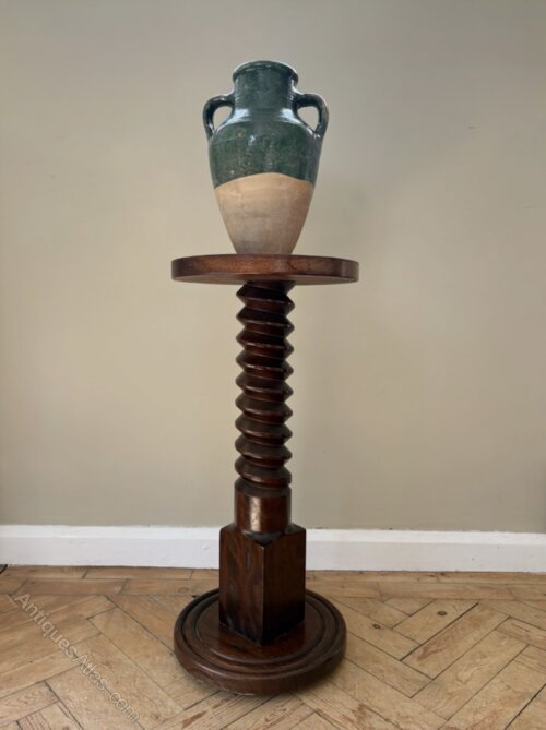 French charm with this old cider press corkscrew pedestal. Good condition with expected wear for its age. It’s a beautiful piece with some lovely detail throughout. Heavy and solid throughout this is a fabulous architectural piece perfect as a standalone pedestal, side table or decoration.Height 73.5cm, Diameter 34cm