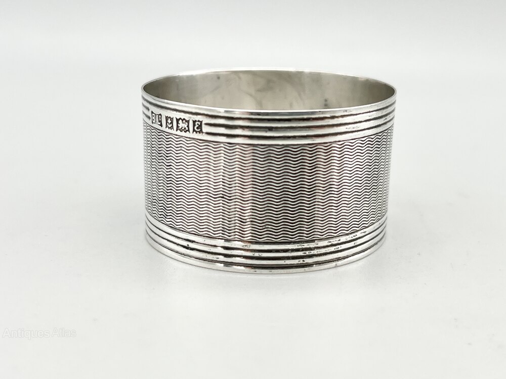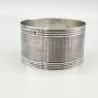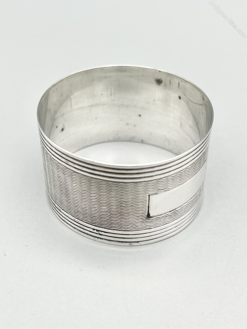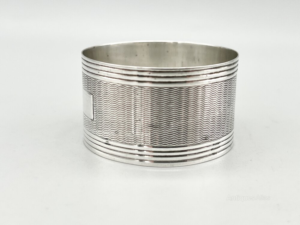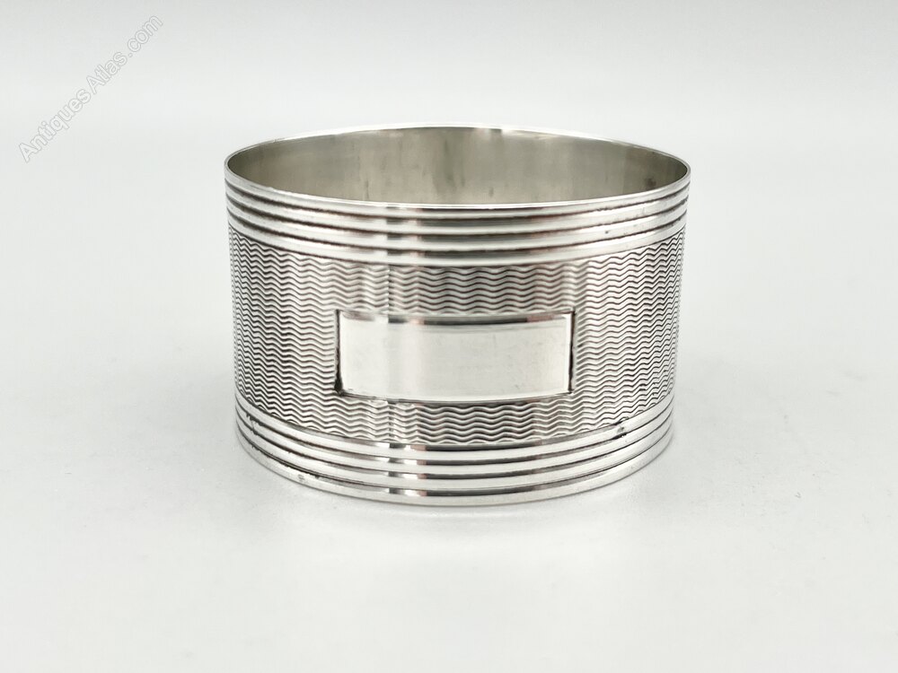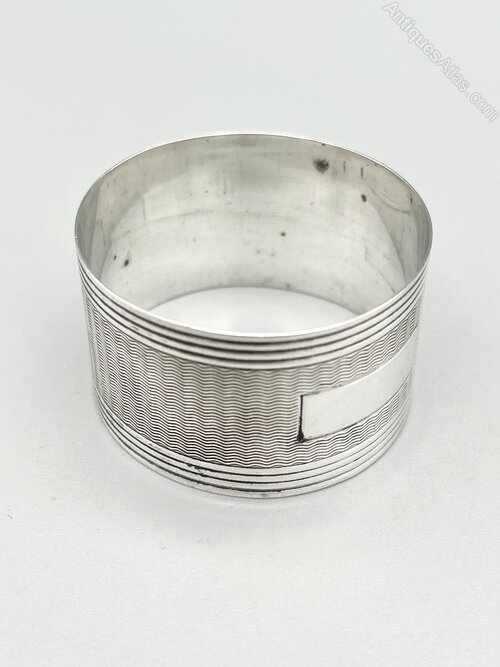 This is a smart Mid-Century Sterling Silver Napkin Ring in the Art Deco style. The circular ring has bands of line decoration at top and bottom and engine turning around the body with a blank oblong cartouche at the front.The napkin ring was made by Bishton's Ltd and assayed in Birmingham in 1954. Founded in 1944, Bishton’s were based in Bromsgrove in Worcestershire. They were jewellery and accessory manufacturers who supplied items to many retailers and also produced a small range of silverware. The firm ceased trading in 2017.