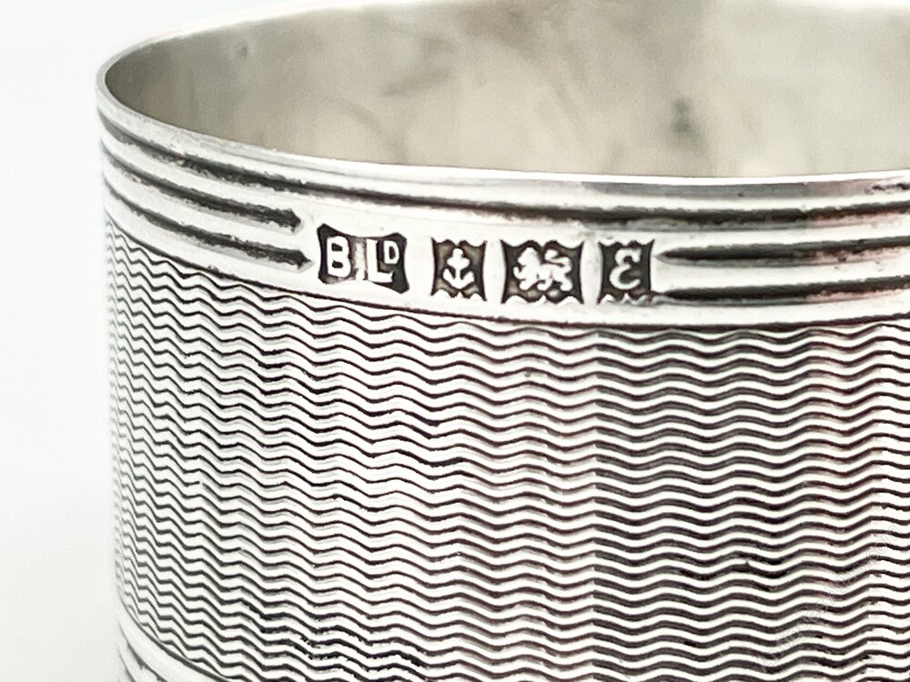 The hallmarks, on the outside of the napkin ring, are well struck and clear to read. They show the lion passant for Sterling Silver, the anchor assay mark for Birmingham, the date letter E for 1954 and the B.Ld makers' mark for Bishton's Ltd.