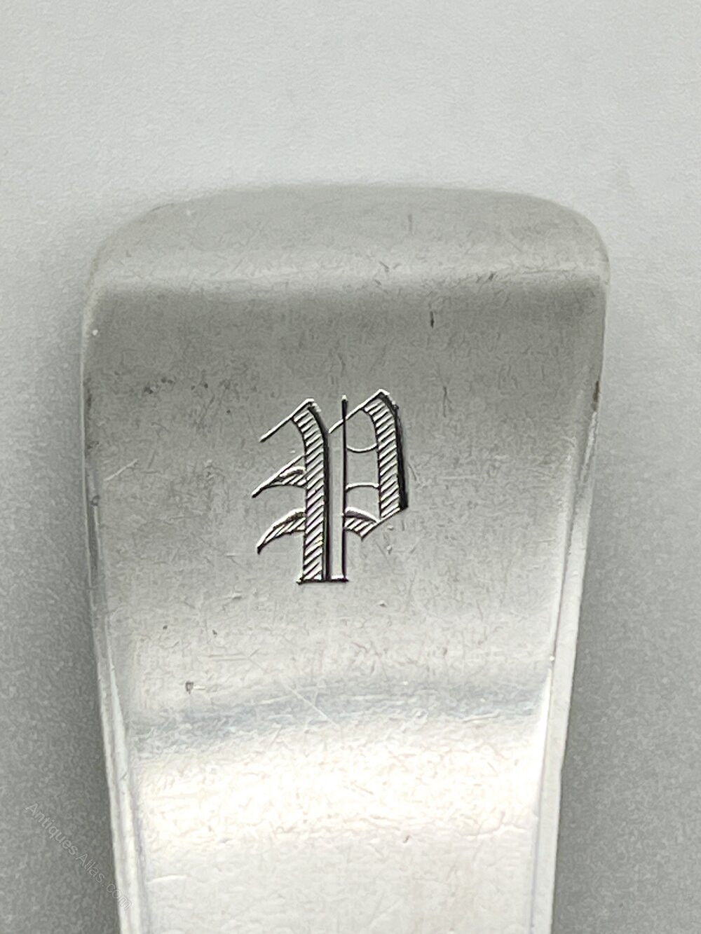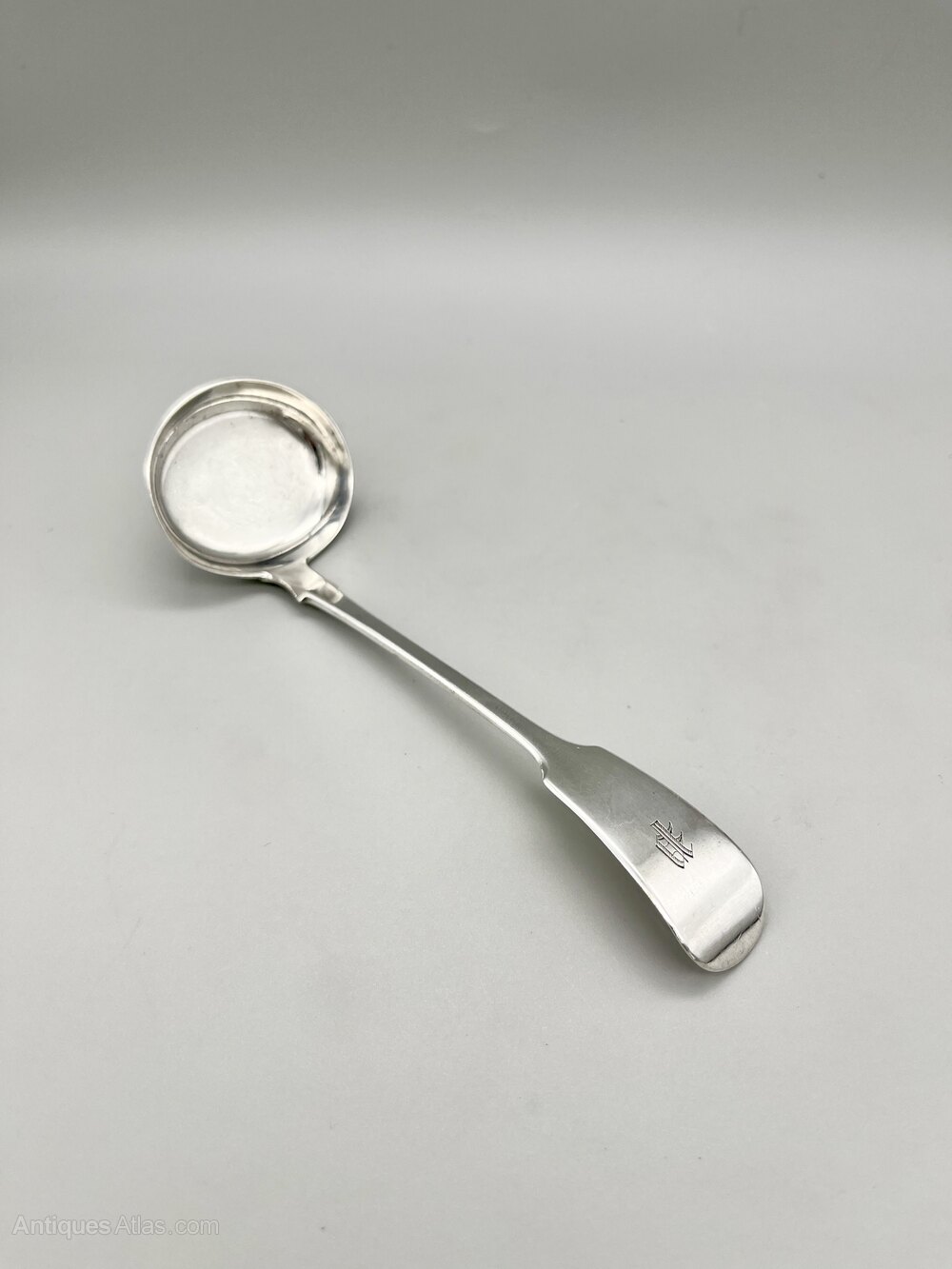 This is a fine early Victorian Sterling Silver Sauce Ladle in the classic Fiddle pattern. It is in the Georgian style with a flat base and shallow bowl. The initial P is neatly engraved at the top of the stem.The sauce ladle was made in Exeter by silversmith John Stone and dates to 1851. John Stone was one of Exeter's foremost silversmiths. He was a specialist spoon maker working from premises initially in New Bridge Street and later the High Street between the early 1820s and his death in 1868. He was succeeded in the business by his son Thomas Hart Stone who registered his own mark in 1863 and after his death in 1873 was in turn followed by his widow Frances Stone.