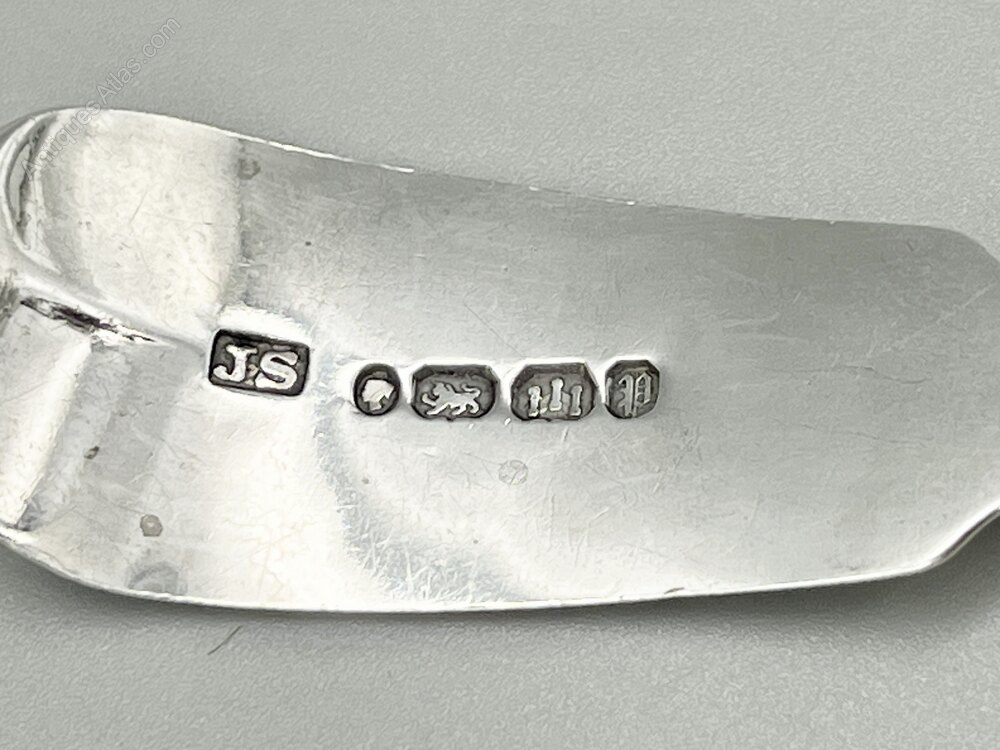 The hallmarks, on the underside of the stem, are well struck and clear to read. They show the lion passant for Sterling Silver, the three towered wall assay mark for Exeter, the date letter P for 1851, the Queen Victoria duty mark and the J S makers' mark for John Stone.