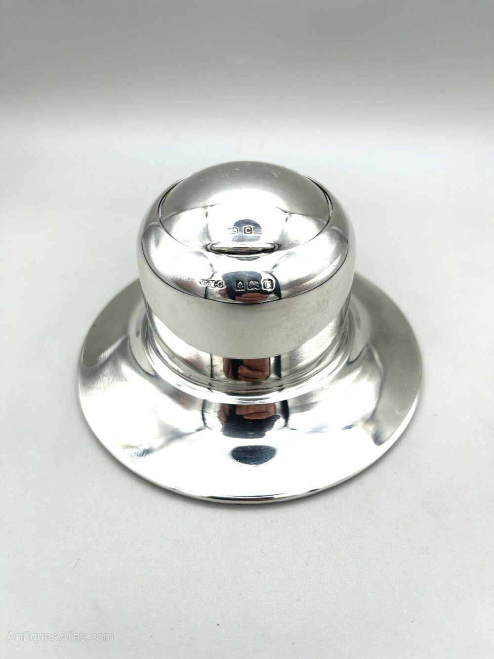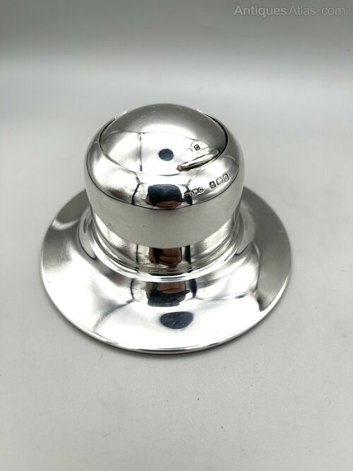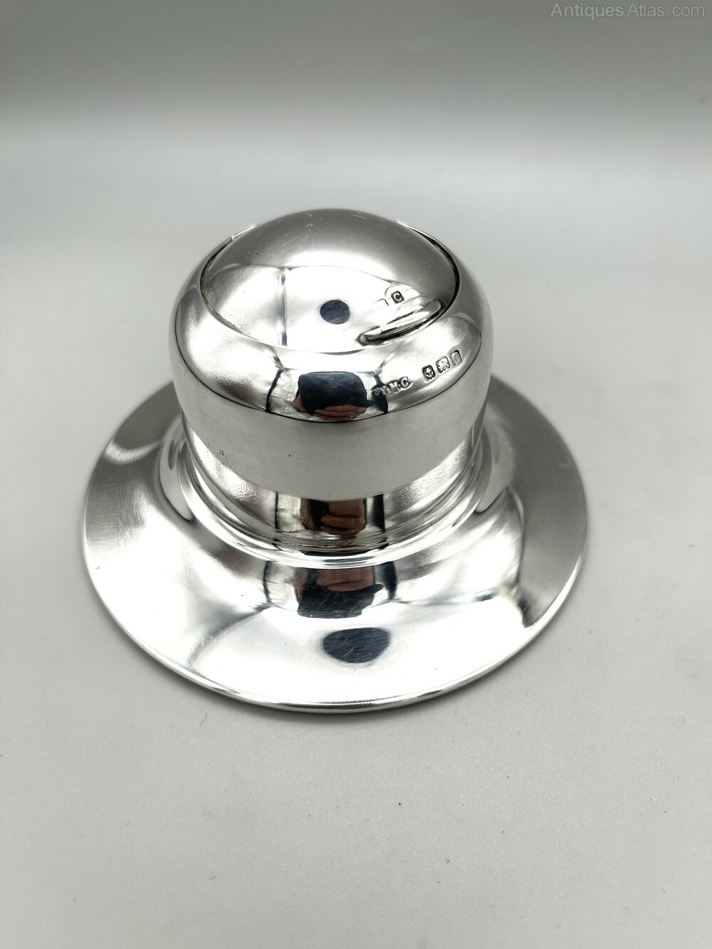 Here we have a stylish and practical Art Deco Sterling Silver Inkwell. The inkwell has a broad circular base, weighted for stability, and a domed cylindrical body. There is a roll back type lid which opens to reveal a bakelite liner within a steel holder. There are no initials or personalisation of any kind.The inkwell was made in Birmingham by the Wilmot Manufacturing Company and dates to 1927. The firm was founded in Birmingham in the early 1900s by Walter Marks, brothers John & William Wilmot and Samuel Cohn. Initially electroplaters, they began manufacturing silverware in 1912 and also produced brass and chrome novelties. In the 1920s they began producing car parts and accessories and by the late 1930s they had moved entirely into this area.