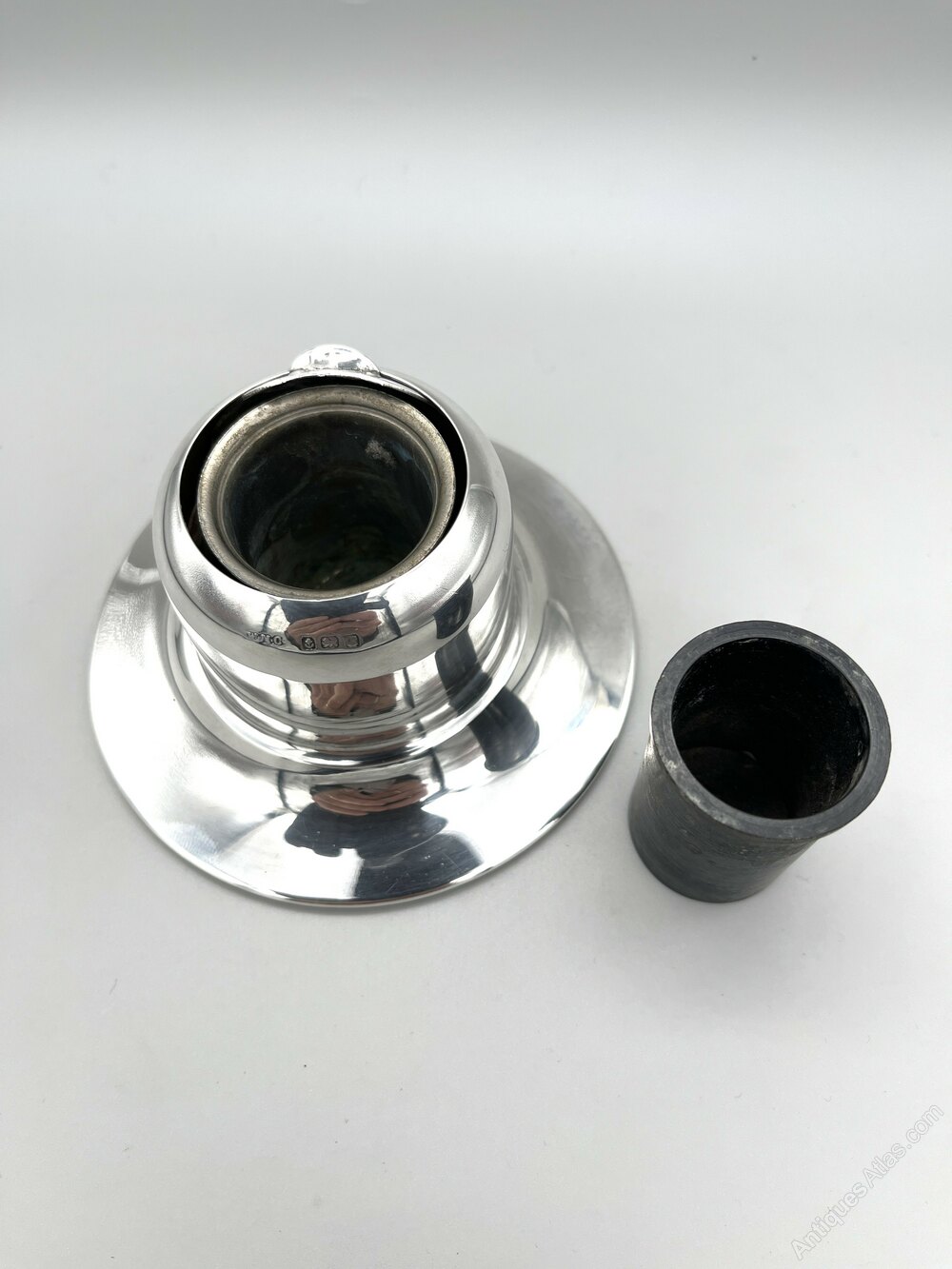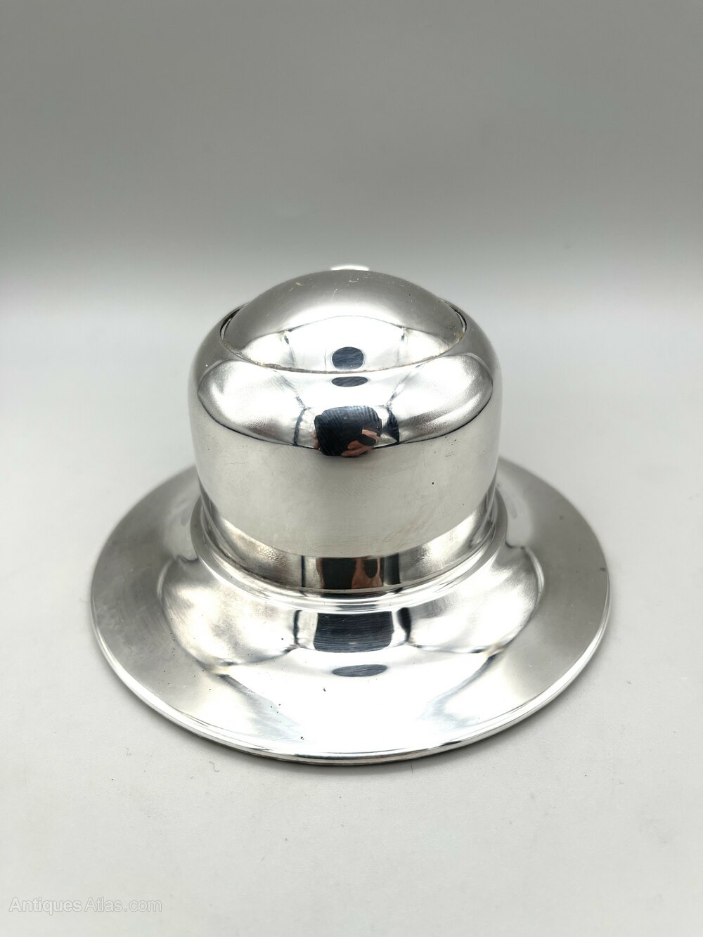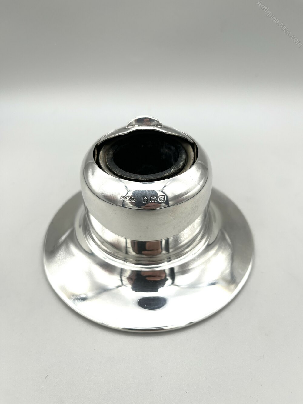 Here we have a stylish and practical Art Deco Sterling Silver Inkwell. The inkwell has a broad circular base, weighted for stability, and a domed cylindrical body. There is a roll back type lid which opens to reveal a bakelite liner within a steel holder. There are no initials or personalisation of any kind.The inkwell was made in Birmingham by the Wilmot Manufacturing Company and dates to 1927. The firm was founded in Birmingham in the early 1900s by Walter Marks, brothers John & William Wilmot and Samuel Cohn. Initially electroplaters, they began manufacturing silverware in 1912 and also produced brass and chrome novelties. In the 1920s they began producing car parts and accessories and by the late 1930s they had moved entirely into this area.