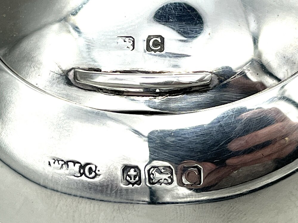 The hallmarks, on the front of the body, are slightly rubbed but still clear to read. They show the lion passant for Sterling Silver, the anchor assay mark for Birmingham, the date letter C for 1927 and the W.M.Co makers' mark for the Wilmot Manufacturing Company.