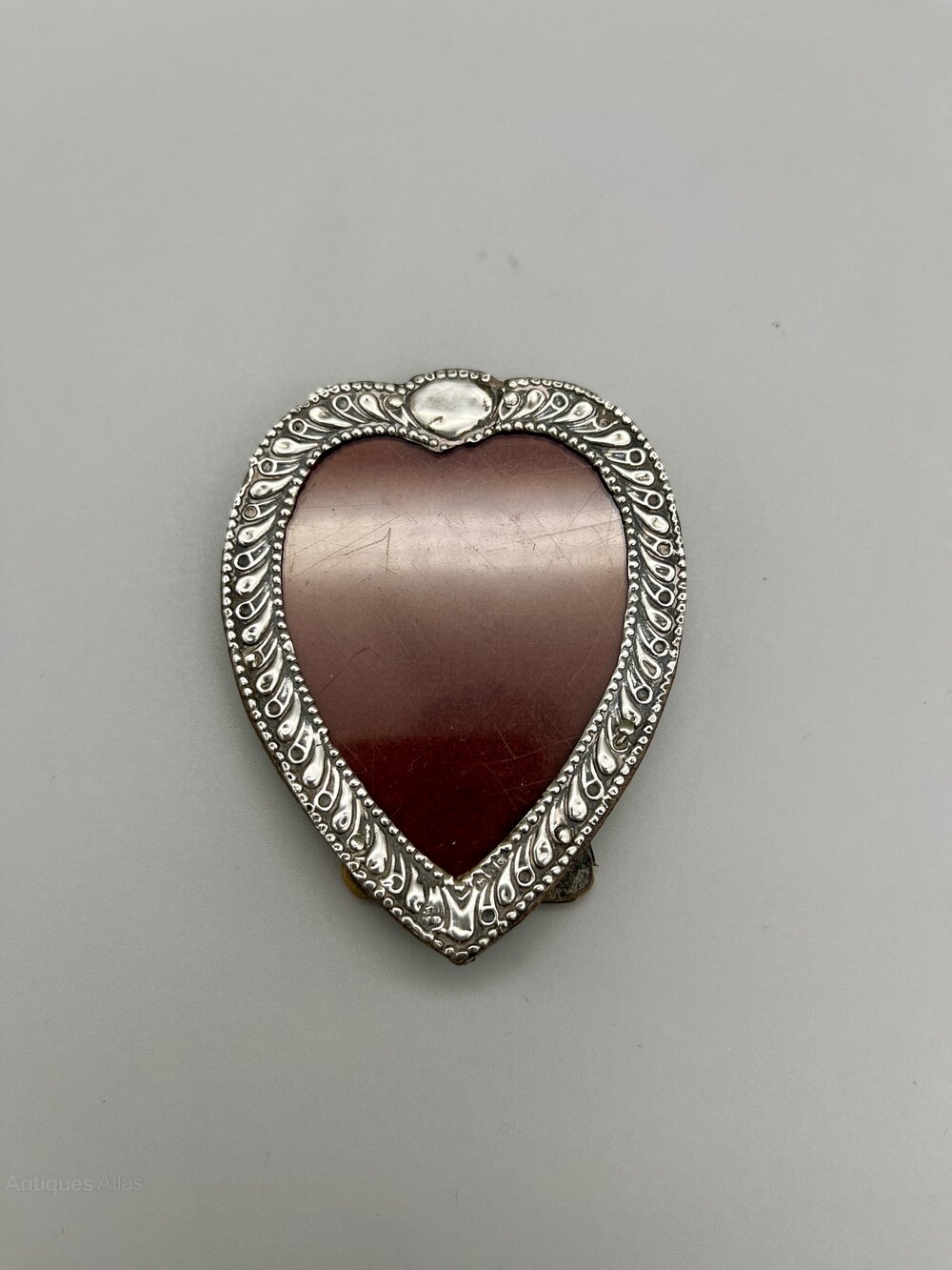 This is a charming small Edwardian Sterling Silver Photo Frame. The frame is heart shaped with an embossed rim and has a visible picture size of 2.25ins by 1.75ins. The easel back has a thin leather covering.The photo frame was made by renowned silversmiths James Deakin & Sons and assayed in Chester in 1902. James Deakin founded the firm in 1866 and by 1878 and had been joined by his son William as partner, with two further sons joining in the 1880s. The company was very successful with manufacturing in Sheffield and Birmingham alongside showrooms in London, Glasgow and Belfast. They remained in business until the mid 1930s.