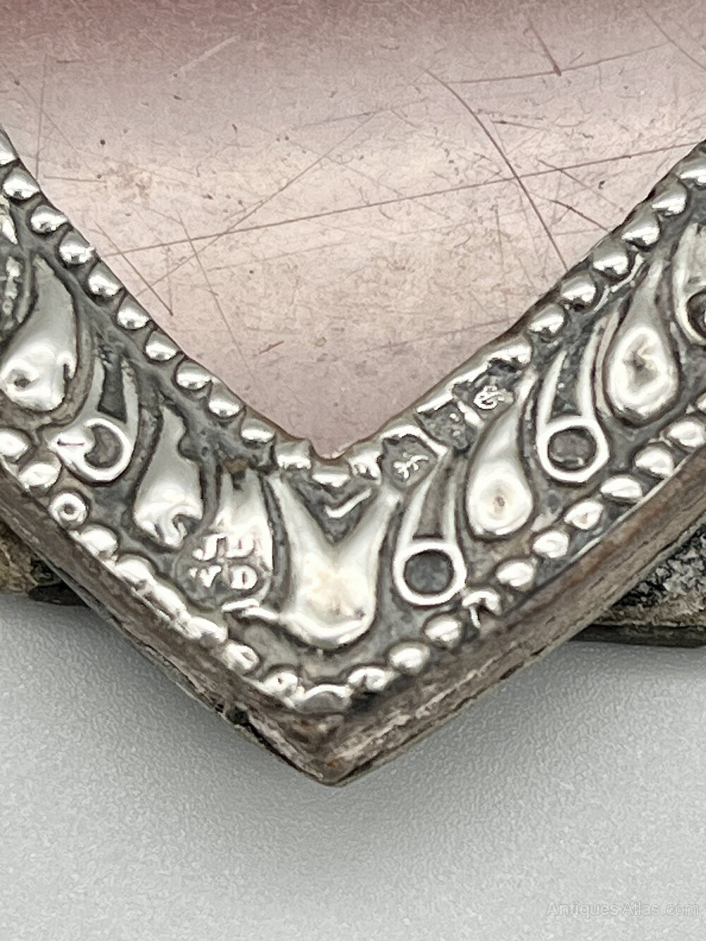 The hallmarks, at the bottom of the frame, are a little rubbed but still clear to read. They show the lion passant for Sterling Silver, the sword and three wheatsheaves assay mark for Chester, the date letter B for 1902 and the J D over W D makers' mark for John and William Deakin of James Deakin & Sons.