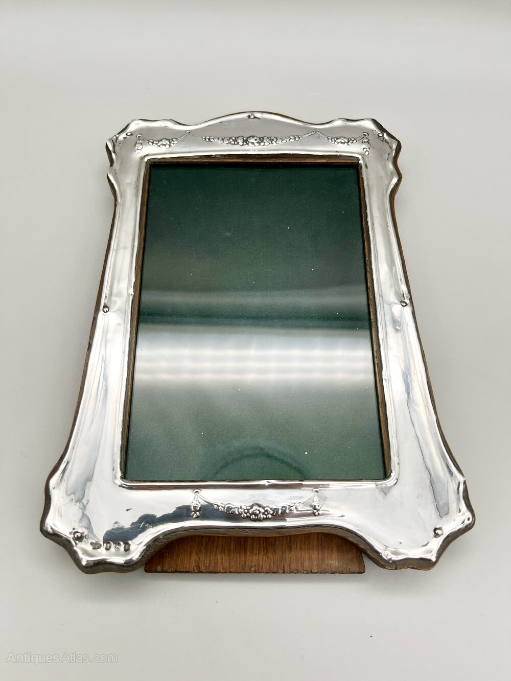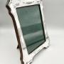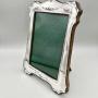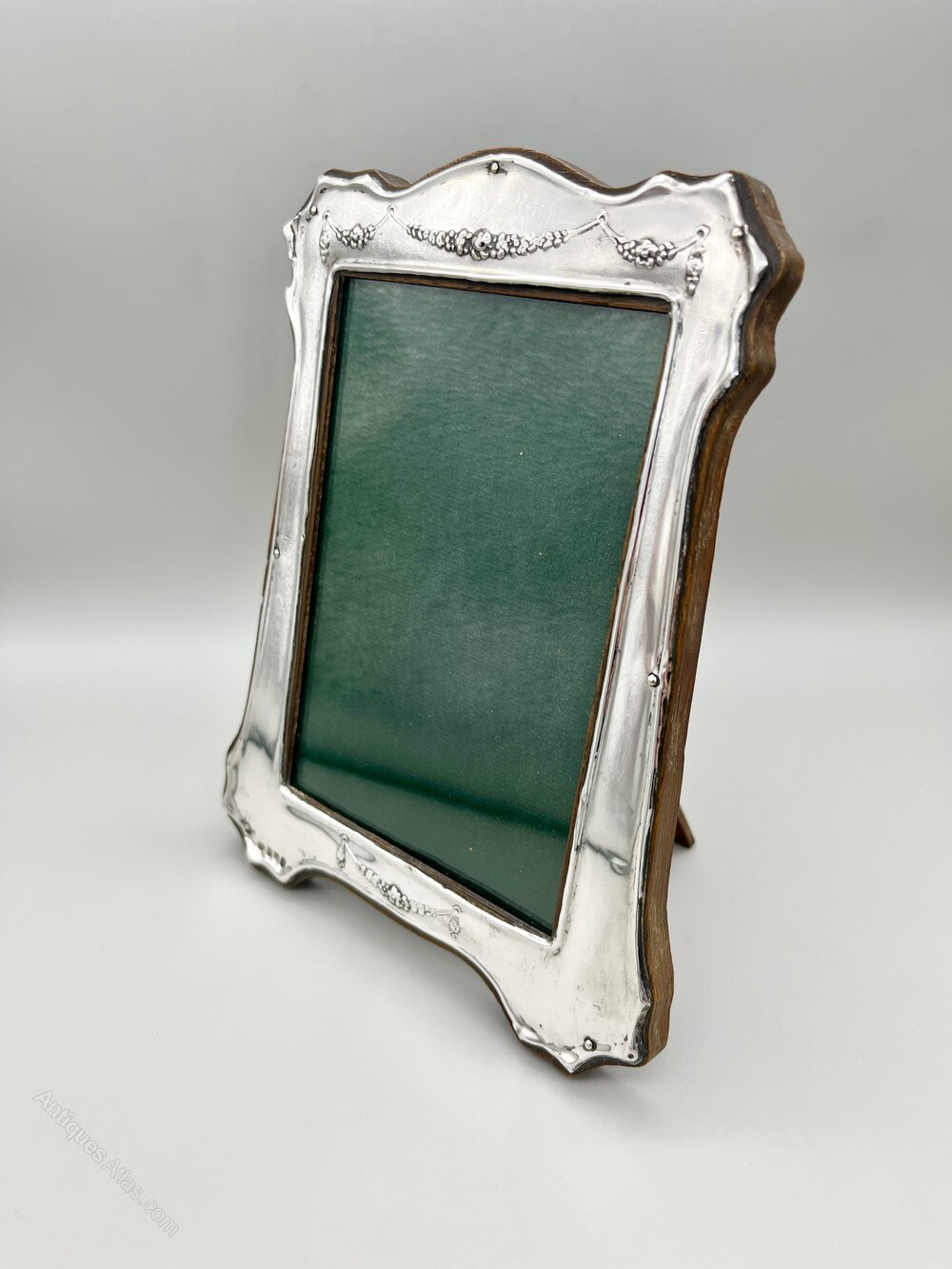 Here we have an attractive George V Sterling Silver Photo Frame with a 5ins by 3.5ins visible picture size. The frame is basically rectangular with scalloped corners and a bowed top. It is decorated above and below the window with floral swags. The back and easel strut are plain wood.The photo frame was made in Birmingham by silversmith Samuel M. Levi and dates to 1918. Founded by Samuel Levi in the 1880s, the firm operated from premises in Birmingham’s Jewellery Quarter primarily producing silverware for personal use such as cigarette cases, perfume bottles, powder compacts, vesta cases, buckles, photo frames and card cases, although they did also produce some tableware. After Samuel’s death the firm became S.M. Levi Ltd in 1931 and ceased trading at the start of the Second World War.