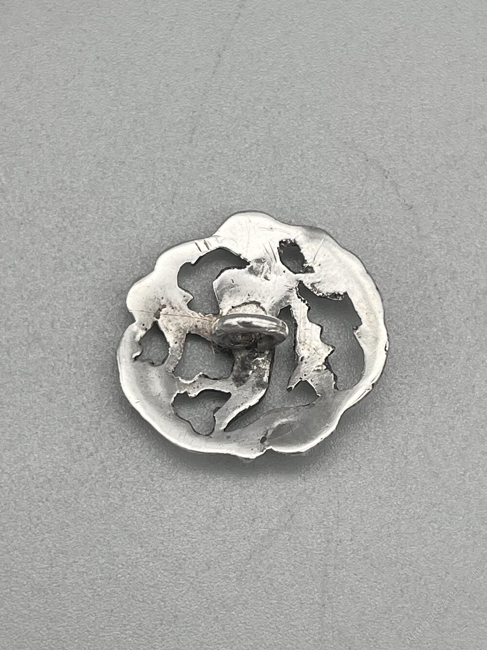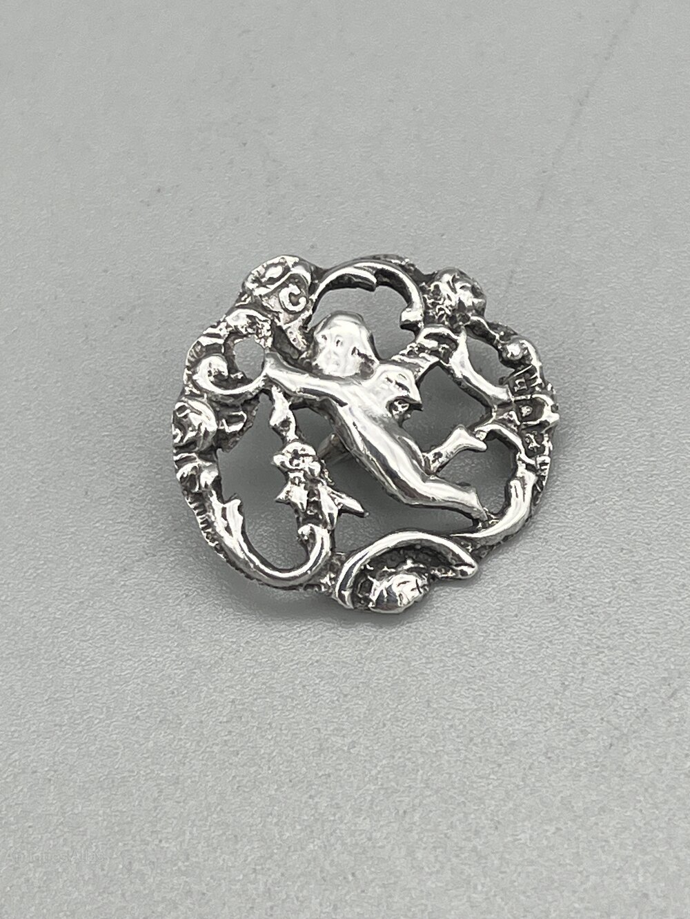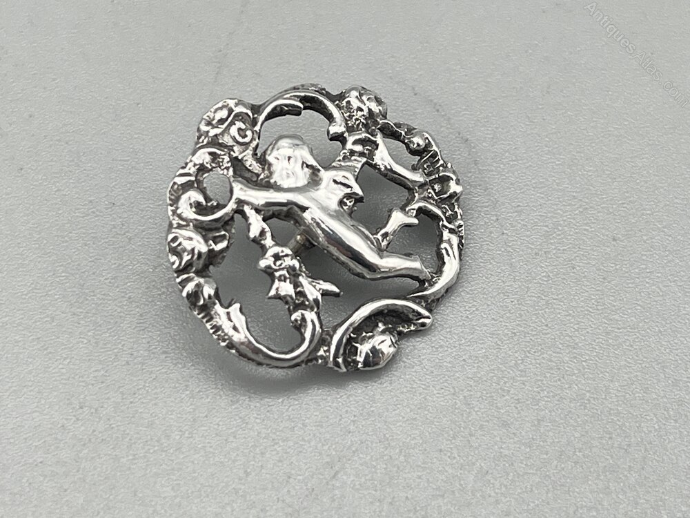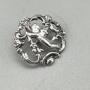 This is an attractive Edwardian Sterling Silver Button. The button is circular with a pierced design of a flying cherub amidst flowers and foliage.The button was made in London and dates to 1903. The makers' mark is partly missing due to the pierced design and only the letter C remains, so we cannot say who made it.