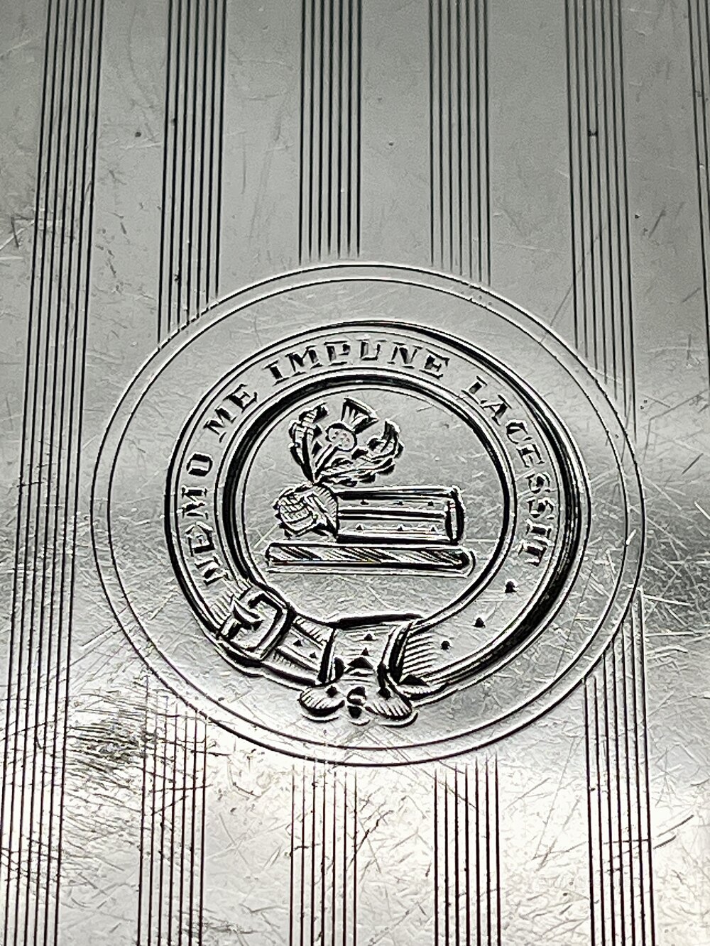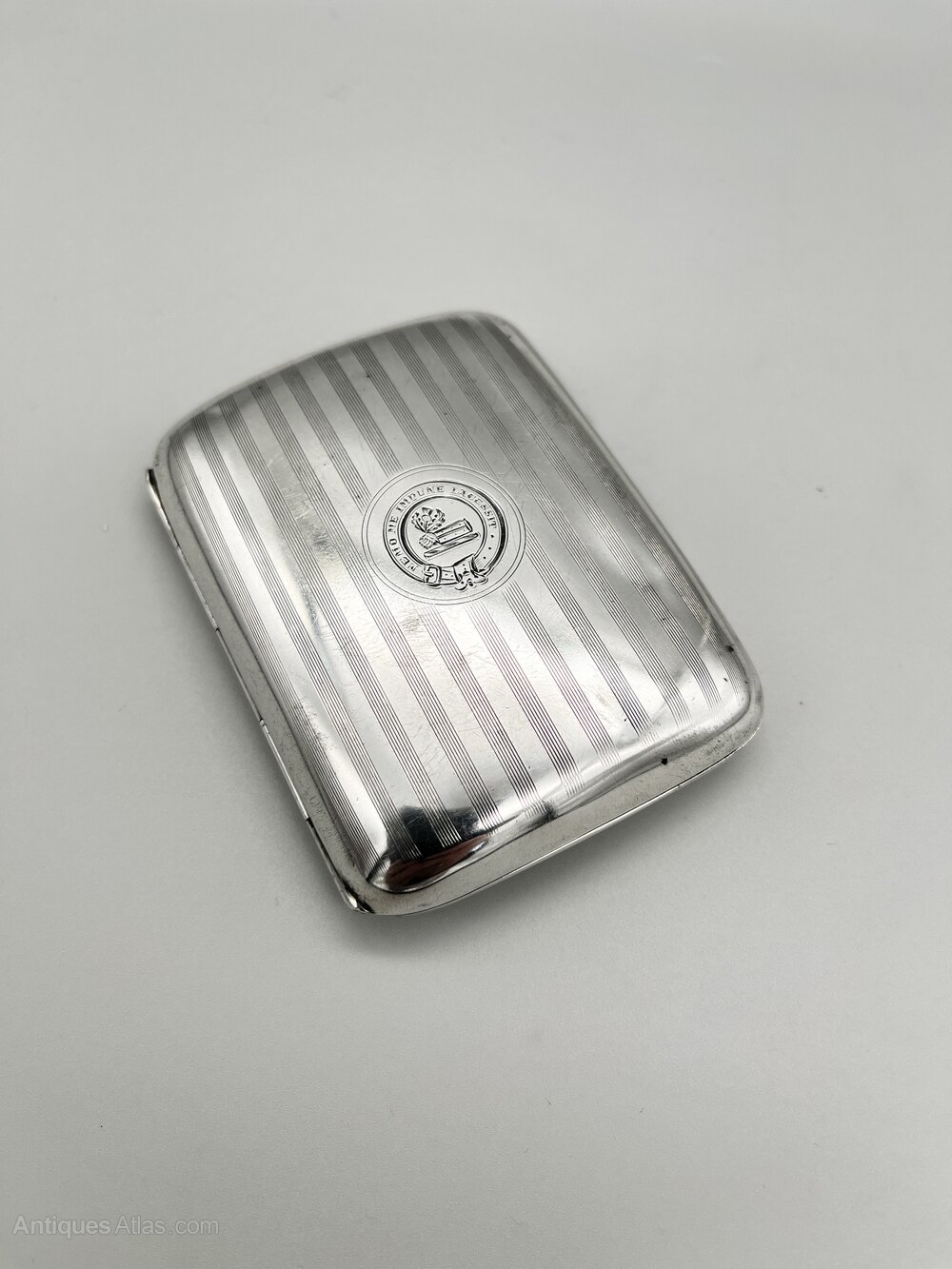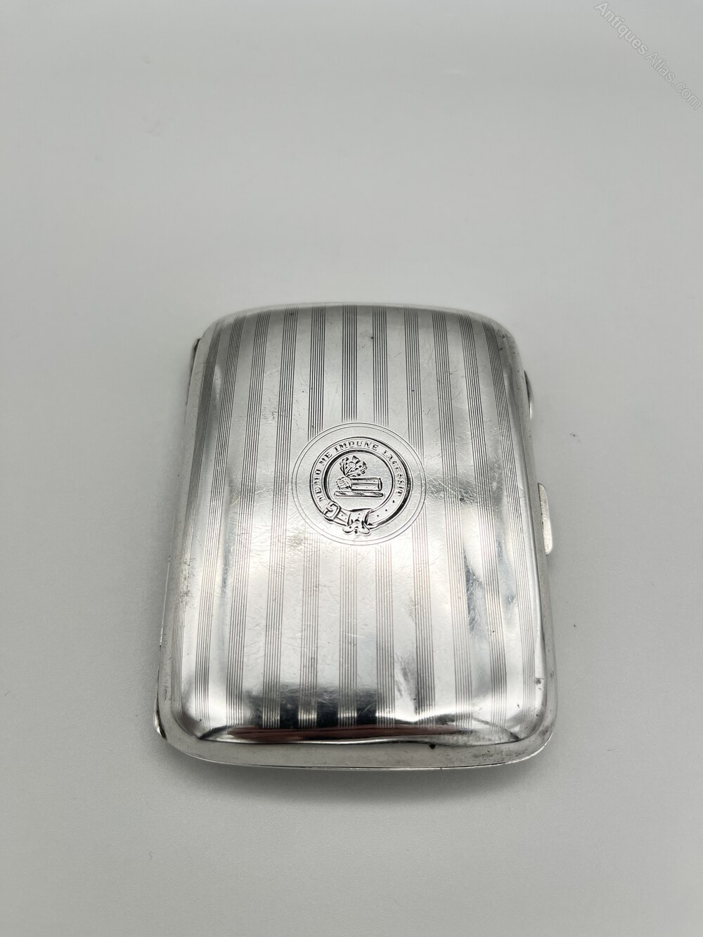 Here we have a handsome Art Deco Sterling Silver Cigarette Case with a gilt interior. The case is oblong with a curved back to fit comfortably into a pocket. Both front and back are decorated with engine turned stripes and the cartouche on the front has a crest of a hand holding a thistle and the Latin motto Nemo Me Impune Lacessit (no one shall provoke me with impunity), which belong to the Irwin family of Ireland.The cigarette case was made in Birmingham by Deakin & Francis and dates to 1938. Deakin & Francis have a proud history as silversmiths and jewellers dating back to 1786. The firm is still run by members of the Deakin family today. They are England's oldest manufacturing jewellers and still working from the same building that they started in back in the 18th century.
