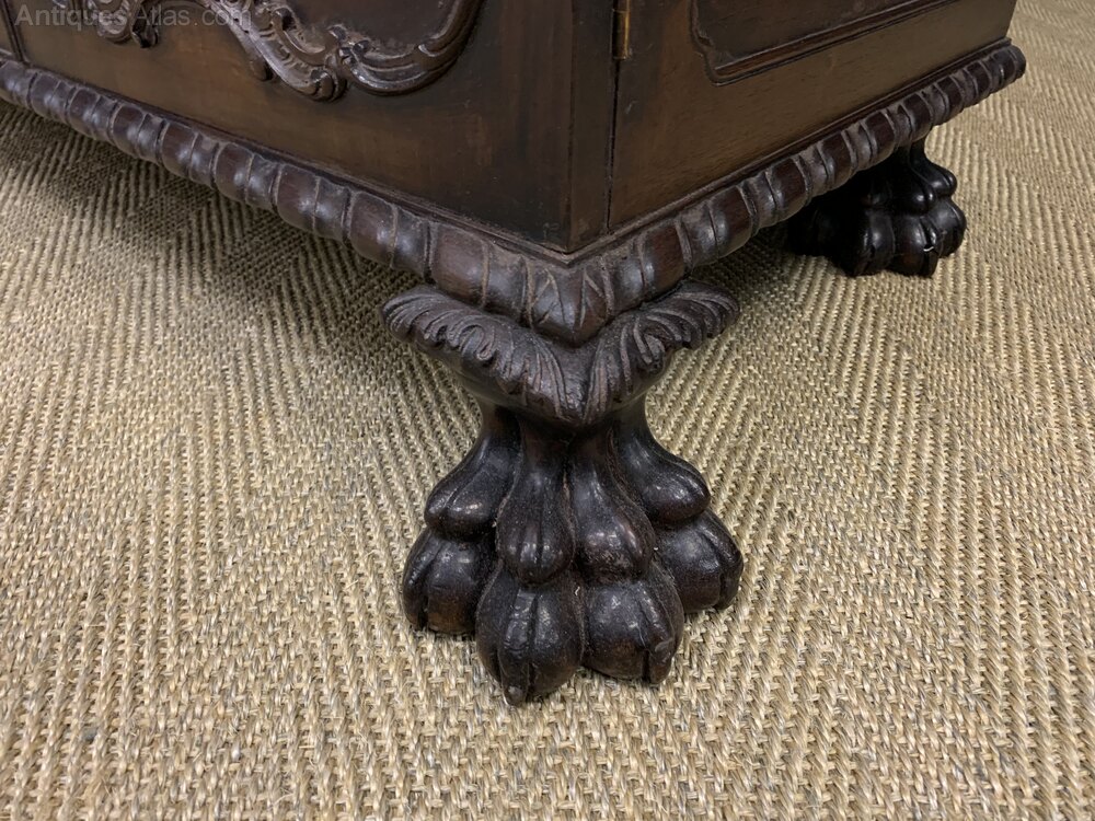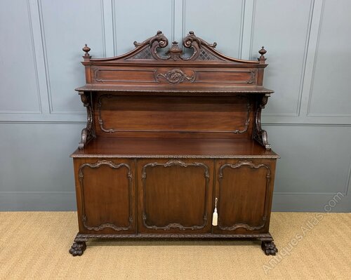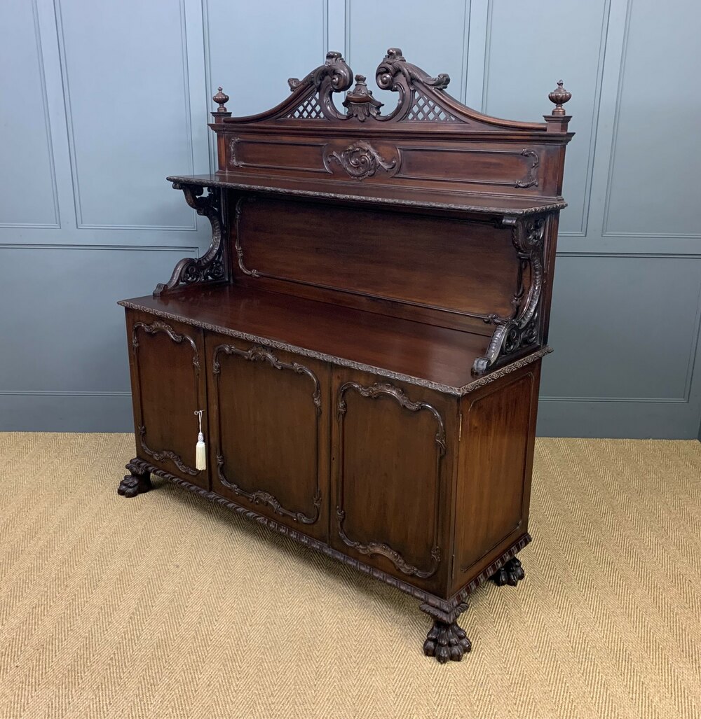 An impressive and ornate late Victorian period mahogany chiffonier or buffet. Very well constructed in dense mahogany timber and embellished with intricate carving in a scrolling fashion throughout. With a pair of cupboard doors (lockable with key supplied) to the base which open to reveal shelved and fitted interiors. All standing on bold "hairy paw" feet. Sympathetically refinished in our workshops to a very high standard. Now offered for sale in excellent overall condition with a great colour and finish, ready to go straight into the home.Dimensions:
