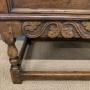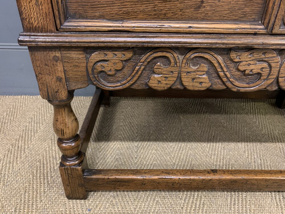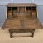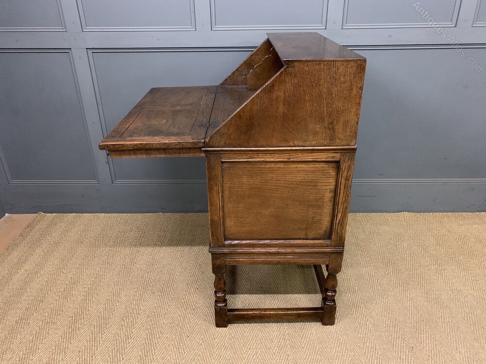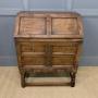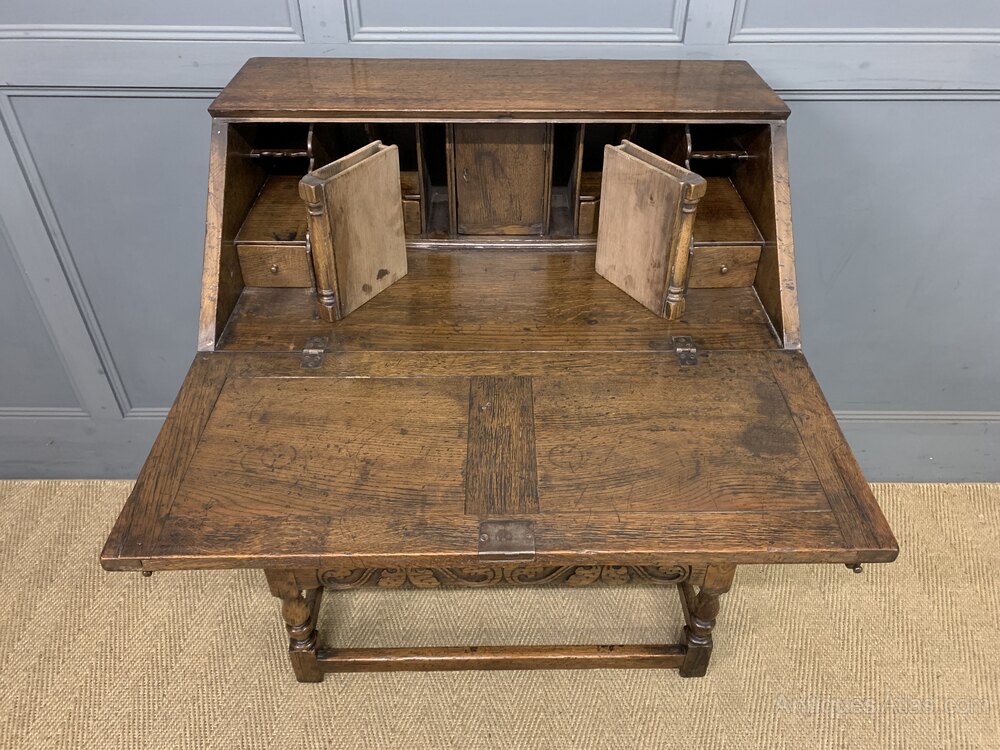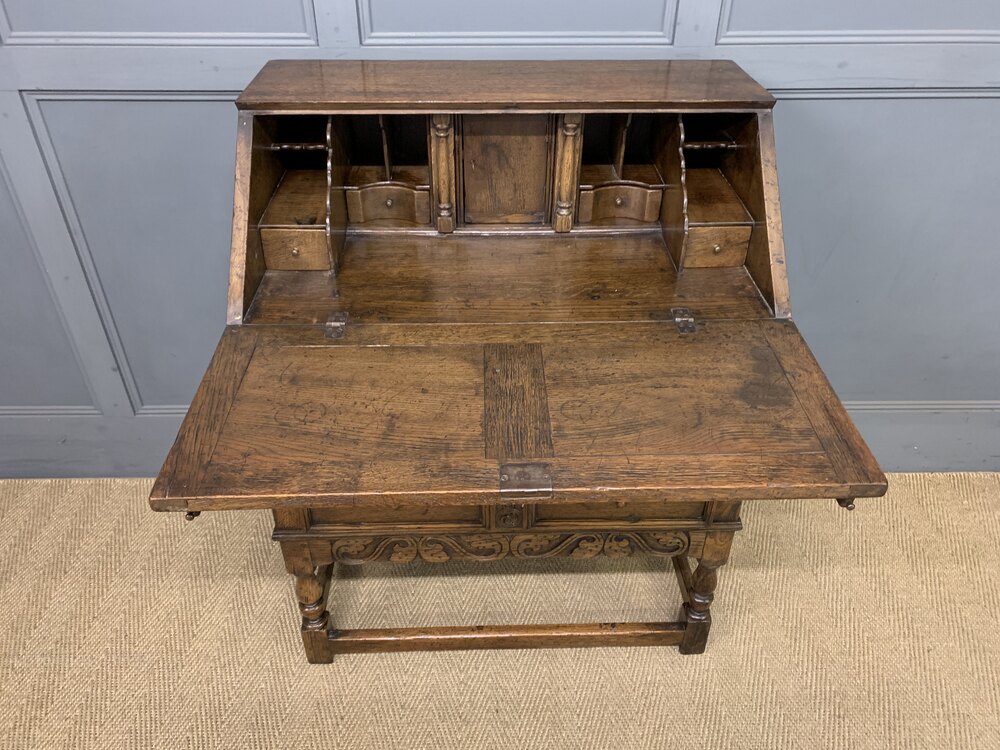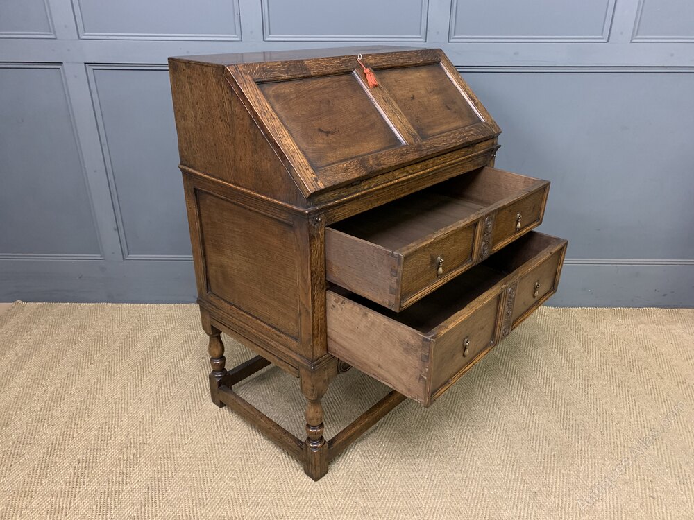 A charming oak bureau from the early 20th century. Well constructed in solid English oak. With a fall front (lockable, key supplied) which opens to reveal a fitted interior complete with "secret" compartments. Beneath there are a pair of drawers, fitted with their original solid brass drop pendant handles. The brureau is embellished with crisply carved decorations to the drawer fronts and freeze. All standing on turned legs , united by under-stretchers. Cleaned and waxed in our workshops and now offered for sale in excellent condition with a good colour and patina.Dimensions: