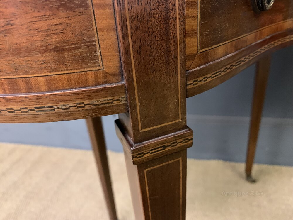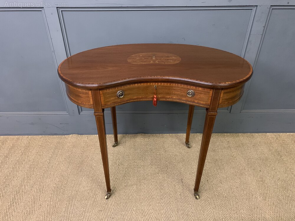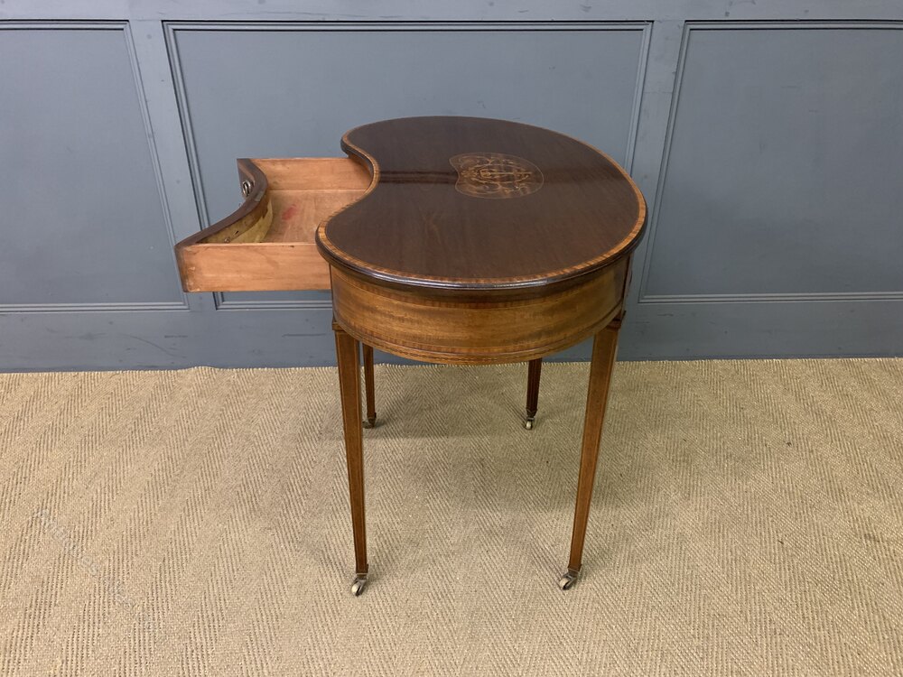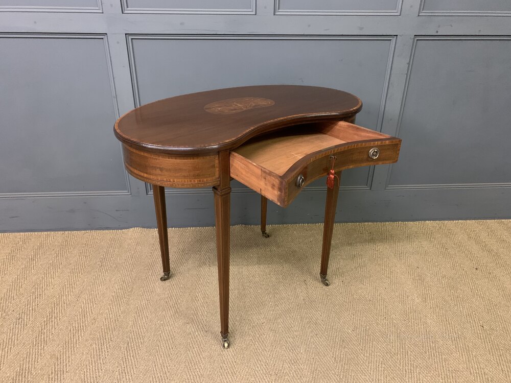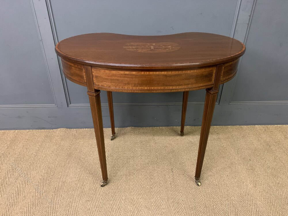 A charming Edwardian period inlaid mahogany kidney shaped table. Well constructed and with a drawer to the freeze (lockable, key supplied). Cross banded in satinwood throughout and with a central inlaid panel to the top. Standing on elegant tapering legs which terminate in original solid brass caps and castors. Sympathetically repolished in our workshops and now offered for sale in excellent condition, ready to go straight into the home.Dimensions: