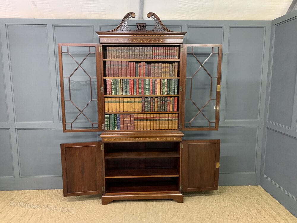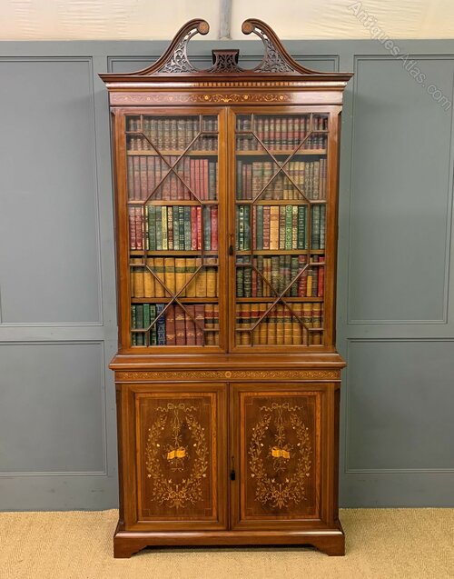 A superb quality inlaid mahogany bookcase by Edwards and Roberts of London. Late 19th century and of fine construction in solid mahogany and attractive mahogany veneers. Embellished with boxwood stringing and satinwood banding throughout. With floral inlaid detailing to the freeze and with profuse floral marquetry inlaid panels to the cupboard doors. The bookcase top with a pair of glazed doors which open to access an interior with adjustable shelving. The top section is surmounted by a broken arch swan neck pediment in open fretwork. The bottom section with a pair of cupboard doors which open to reveal an interior with adjustable shelving. All doors are lockable (keys supplied). Both bottom and top sections with canted corners. Sympathetically refinished in our workshops to a very high standard. Now offered for sale in excellent condition with a rich colour and patina. Splits into two sections for ease of installation.Dimensions: