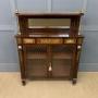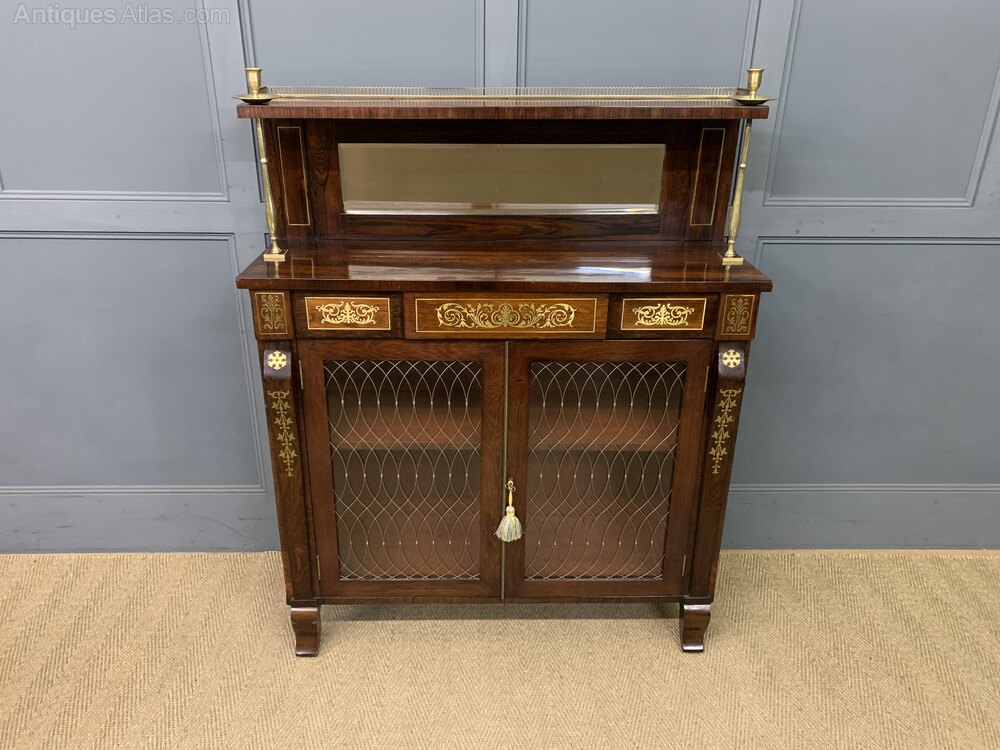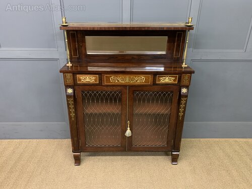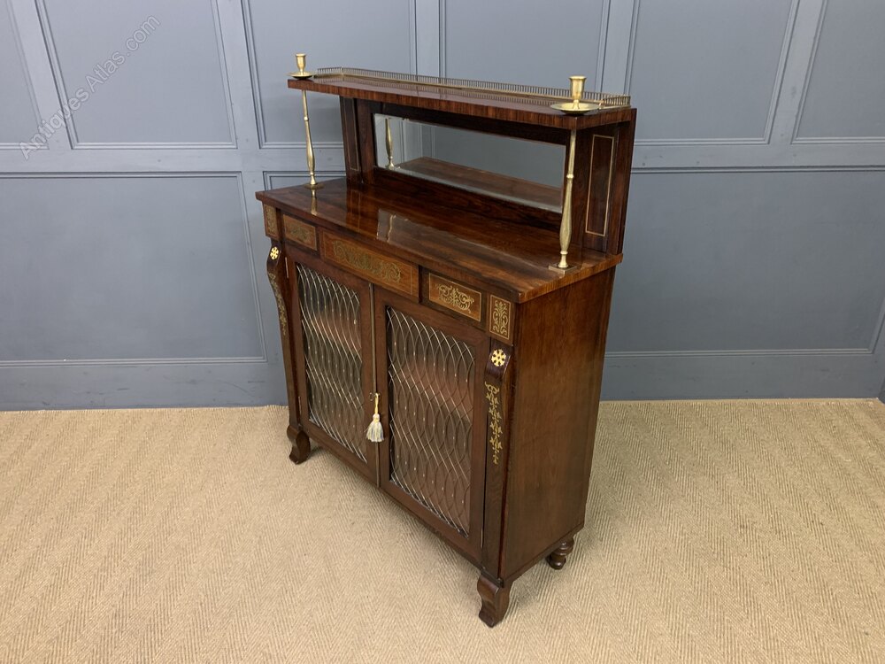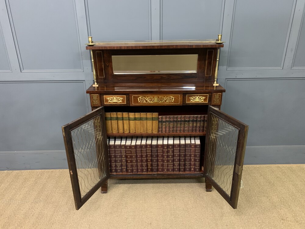 A beautiful Regency period brass inlaid rosewood chiffonier, or side cabinet. Of fine construction in solid rosewood and attractive rosewood veneers. Decorated with inlaid brass ware throughout. The superstructure is surmounted by a brass gallery and includes original brass candle sconces, a very rare feature indeed. The upstand contains a mirror back and is flanked by brass supports. The main body of the cabinet has a pair of doors which open to access a shelved interior. The glazed doors are fitted with original brass meshwork panels and are flanked by pillasters. The doors are lockable, key supplied. Sympathetically refinished to a very high standard and now offered for sale in excellent condition, ready to go straight into the home.Dimensions: