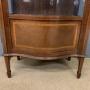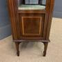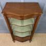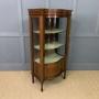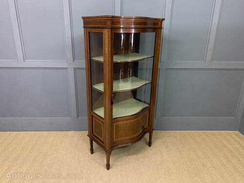 A charming Edwardian period inlaid mahogany display cabinet. Of serpentine form and very well constructed in solid mahogany with attractive fiddle-back mahogany veneers. Probably made by Maple & Co of London. Decorated with satinwood cross banding and boxwood stringing throughout. The single door opens to access a shelved and lined display space. The door is lockable (key supplied). All standing on short square tapering legs which terminate in spade feet. Cleaned and waxed in our workshops. Now offered for sale in very good original condition with a good colour and patina.Dimensions: