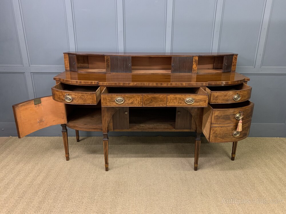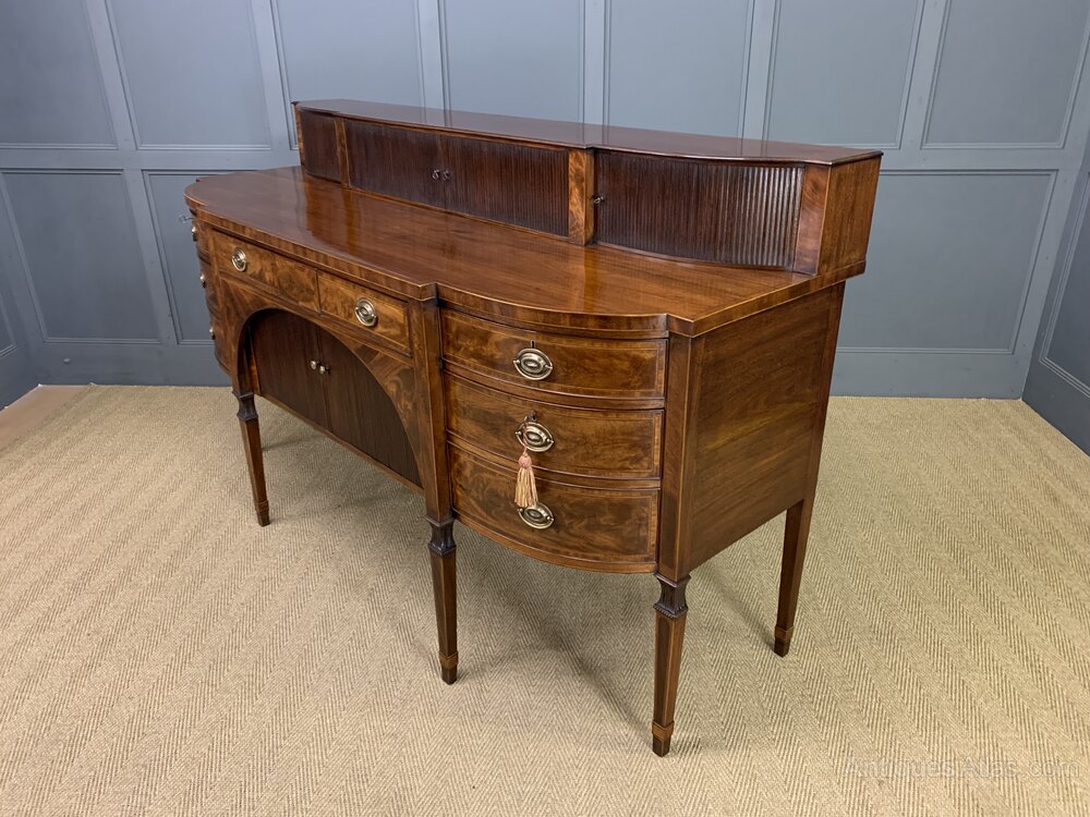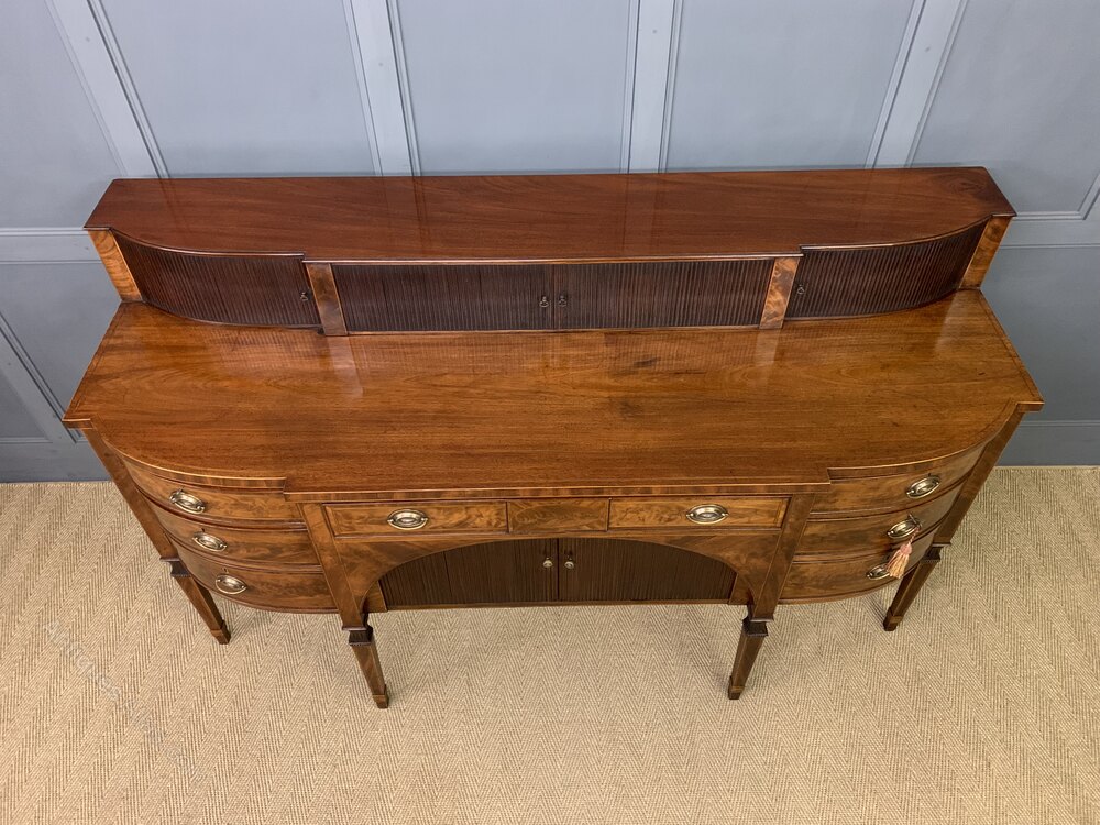 A large and imposing George III, Sheraton period, inlaid mahogany sideboard. Of generous proportions and of break-fronted form. Very well constructed in solid mahogany with attractive mahogany veneers and embellished with boxwood stringing inlay throughout. The superstructure with 3 tambour fronted cupboards. The main body of the sideboard with an arrangement of end cupboards and drawers flanking a long central drawer over a tambour fronted cupboard. All end cupboards and drawers are lockable (keys supplied). All standing on elegant tapering legs with carved capitols and collars. Sympathetically refinished in our workshops to a very high standard. Now offered for sale in excellent condition with a rich colour and good patina.Dimensions: