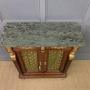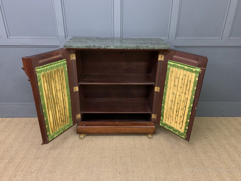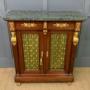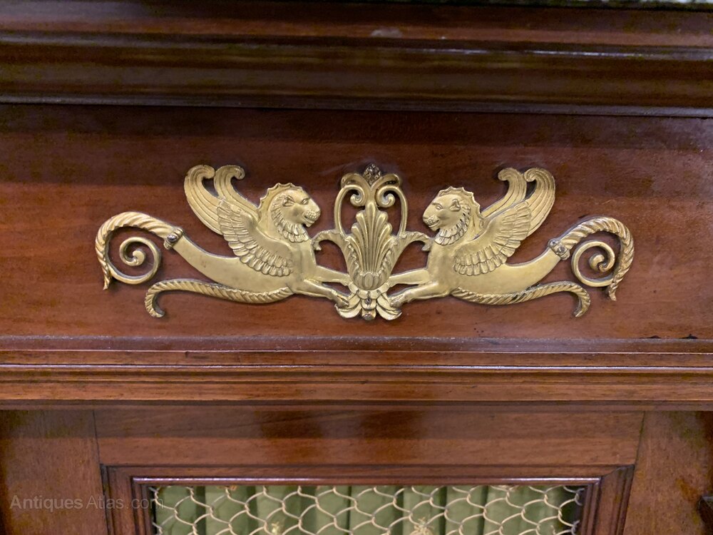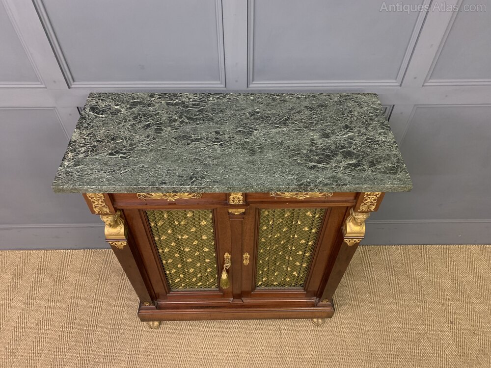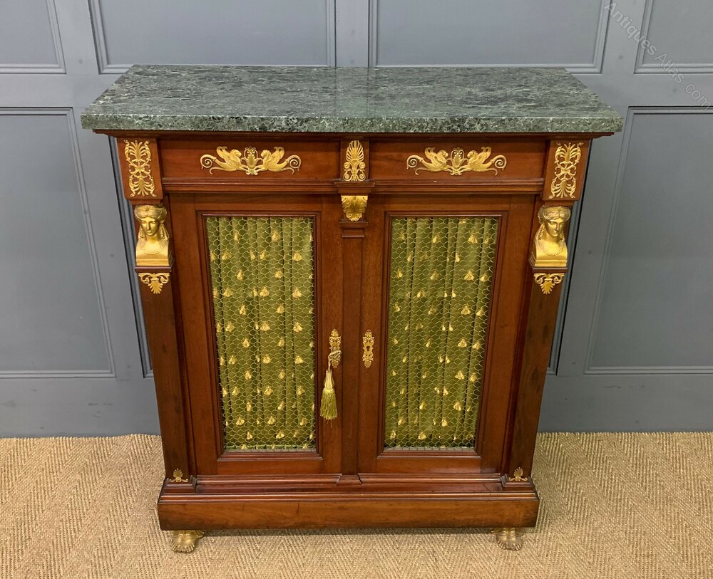 A splendid 19th century mahogany French Empire chiffonier, or side cabinet. Of excellent construction in mahogany with a varigated blue/green marble top. Embellished with fine quality crisply cast ormolu mounts. With a pair of doors (lockable, key supplied) fitted with brass grills with silk material behind. The doors open to reveal a shelved interior and are flanked by a pair of monopodia topped with female busts and terminating in elaborate feet. This stunning cabinet is offered for sale in very good original condition.Dimensions: