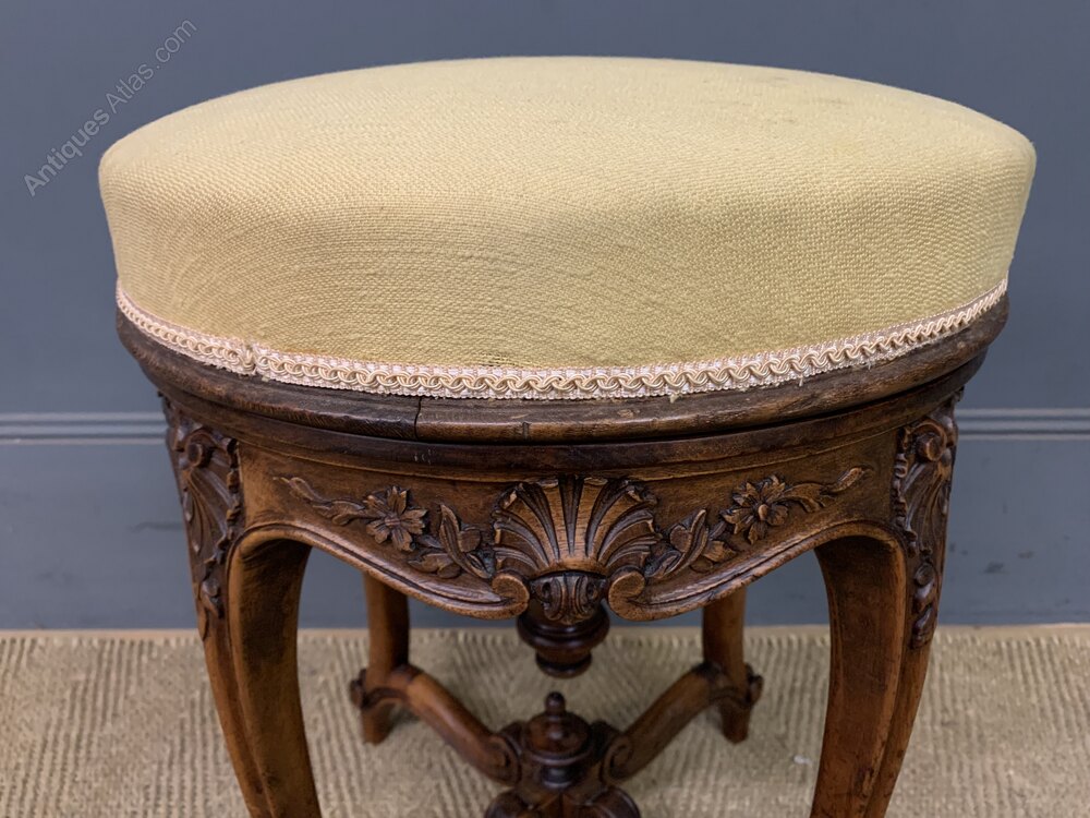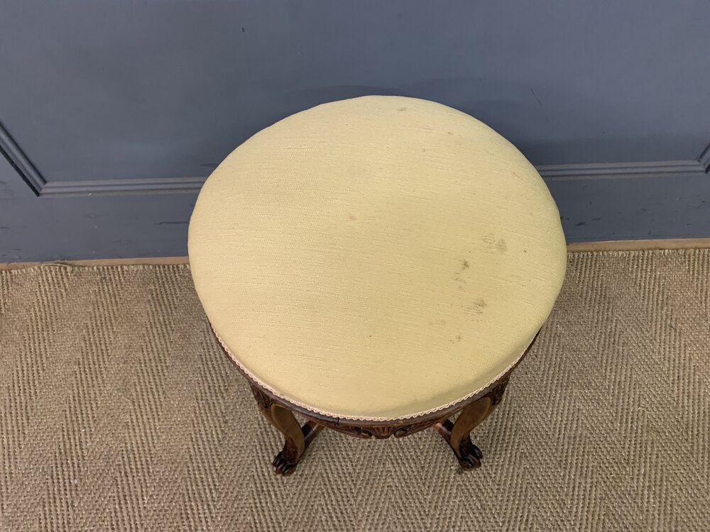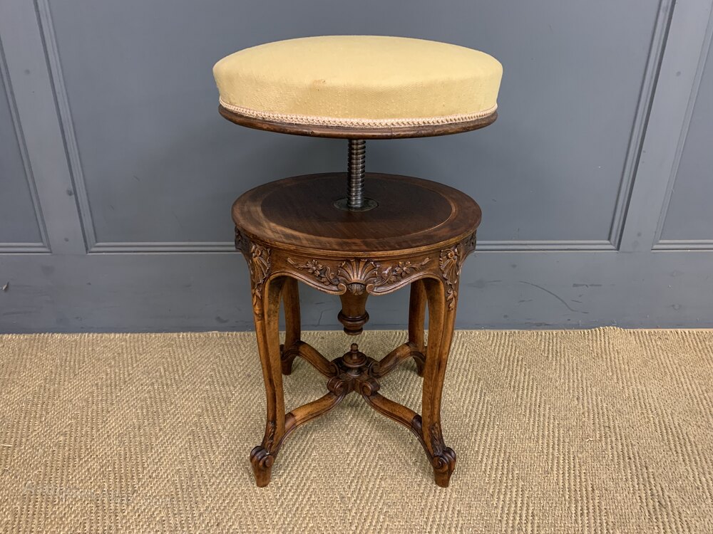 A charming 19th century French walnut piano stool. With a rotating top making it adjustable in height. With a lovely frame in solid walnut with crisply carved decorations, The cabriole legs are united by under-stretchers giving extra strength and stability. Cleaned and waxed in our workshops and now offered for sale in very good condition with a good colour. Some historic marks to the fabric.Dimensions: