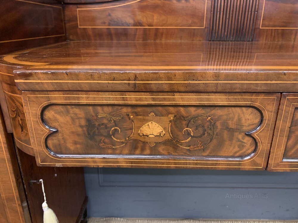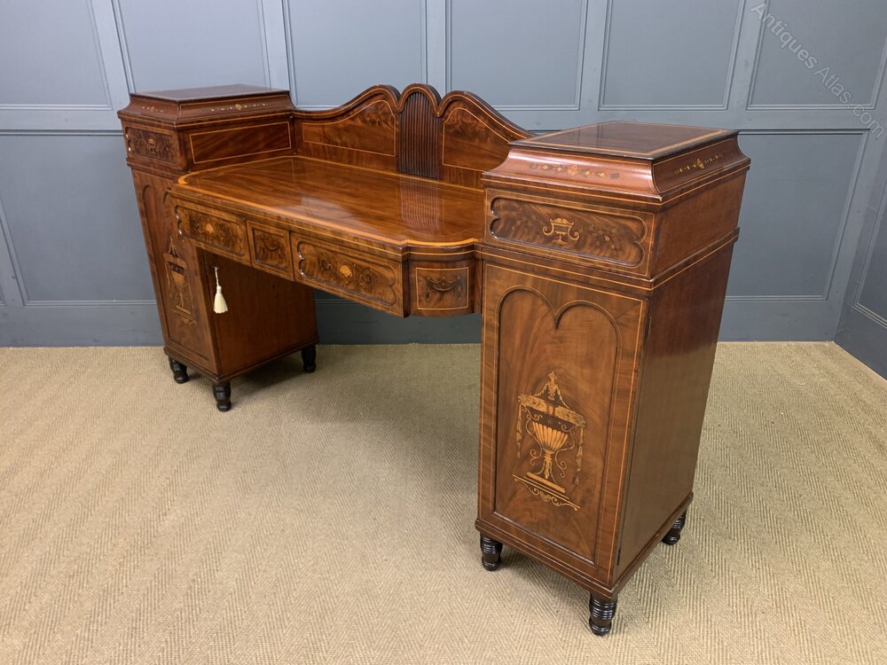 A very good George III period inlaid mahogany pedestal sideboard. Of generous proportions and of good construction in solid mahogany and attractive flame mahogany veneers. Decorated throughout with satinwood cross banding and boxwood stringing. Further embellished with inlaid marquetry panels of floral patterns and neo-classical urns. Each pedestal with a short drawer over a cupboard. One cupboard fitted with shelving, the other with a deep drawer. Both cupboards are lockable, key supplied. The central section of convex form with a pair of asymetrical drawers. All standing on ring turned bun feet. Offered for sale in good country house condition. Some minor imperfections as shown in photos, or please ask for further details. Splits into 4 sections for ease of installation.Dimensions: