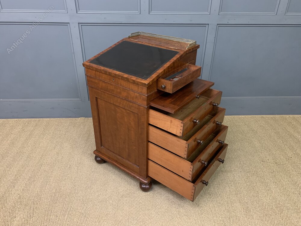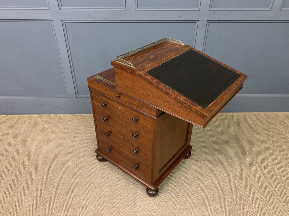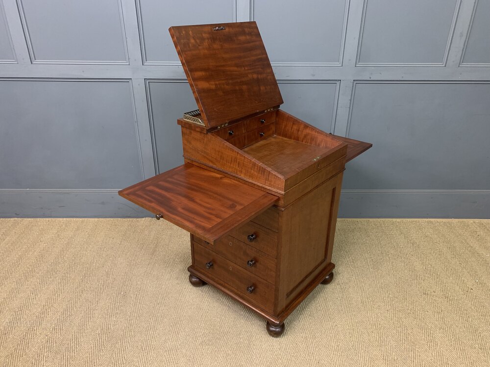 A superb quality George IV period mahogany Davenport by Gillows of Lancaster (not stamped). Of fine construction in solid mahogany with attractive mahogany veneers. With a sliding top, fitted with a brass gallery and a sumptuous leather writing surface complete with gilt tooled decorations. The lift up top opens to reveal an interior with 2 short drawers and 2 dummy drawers. The handle to one of the dummy drawers pulls out in order to release the hinged stationary tray. With a pair of pull-out slides and a series of 4 drawers to one side and 4 dummy drawers to the other side. All standing on solid turned bun feet. Cleaned and waxed in our workshops and now offered for sale in excellent condition, with a wonderful colour and patina. One drawer indistinctly signed to the underside.See Gillows' Estimate Sketch Books pp. 3788 and 3953 for almost identical designs dated October 16th, 1830 and January 5th, 1833 respectively.