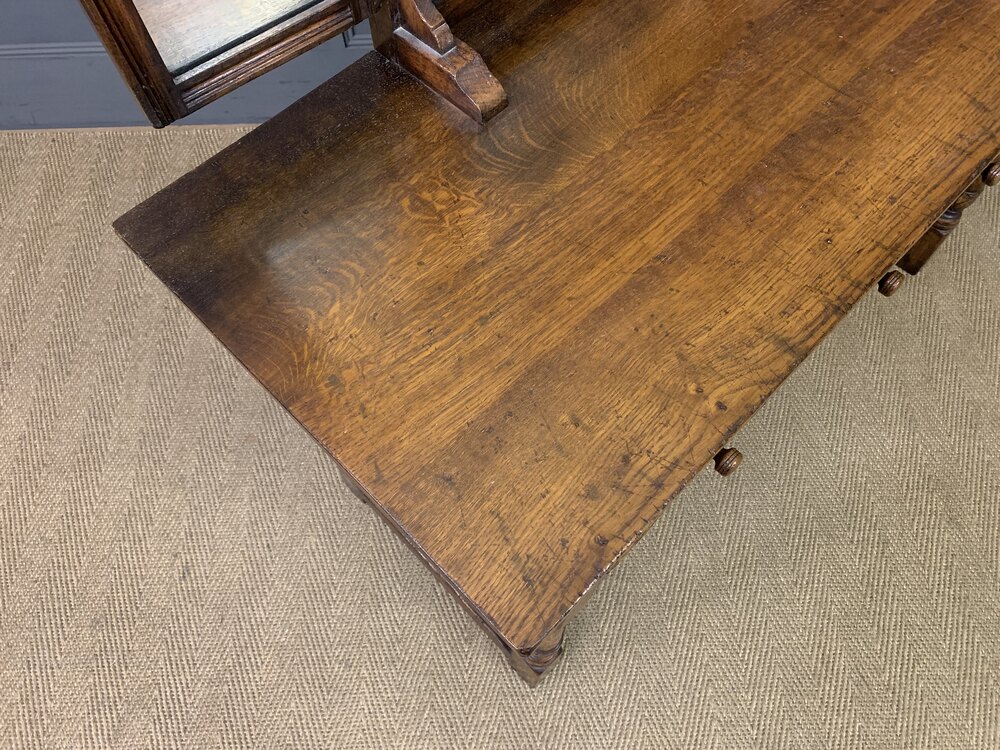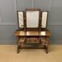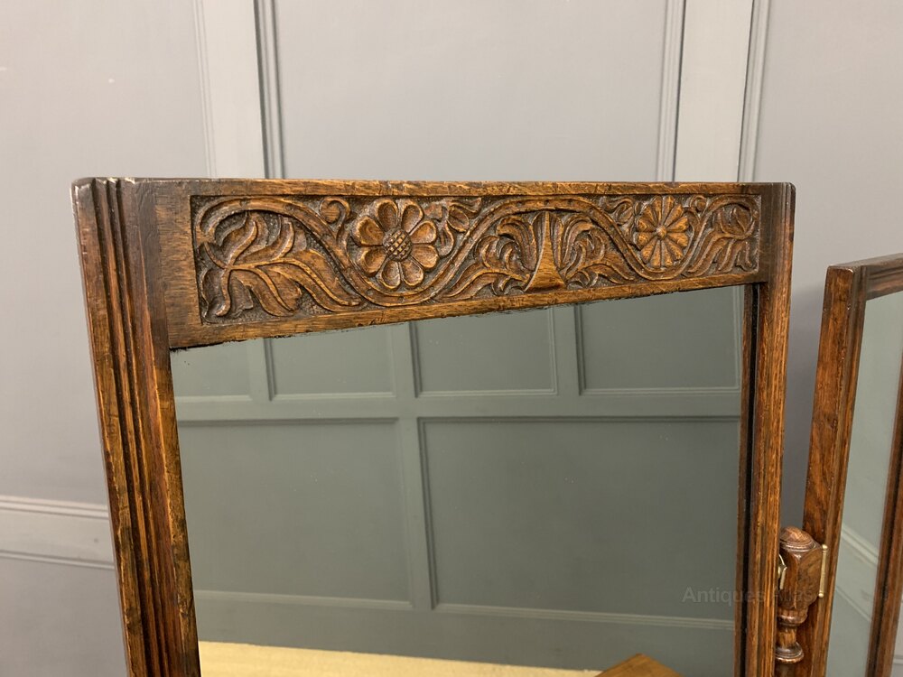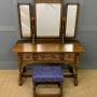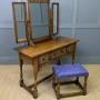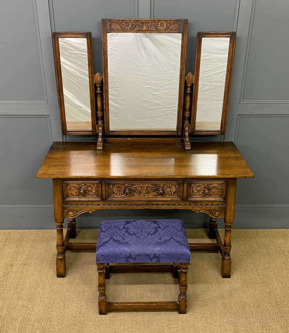 A charming Ipswich oak dressing table and matching stool by Titchmarsh and Goodwin of Ipswich. Very well constructed in solid English oak, now with a wonderful colour and patina. With triple mirrors, fully adjustable and an arrangement of 3 drawers. Decorated with crisply carved detailings to the drawer fronts and the top rail. The stool with blue upholstery which is in perfect condition. Cleaned and waxed in our workshops and now offered for sale in excellent overall condition.Dimensions:
