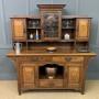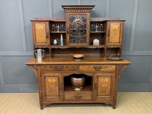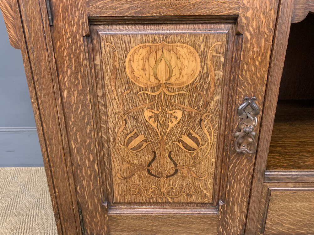 A superb Arts and Crafts period oak sideboard by Shapland and Petter of Barnstaple. Excellent construction in solid English oak , showing beautiful medullary rays and of generous proportions. Decorated with stunning stylised floral inlaid panels throughout. The top section with a central glazed door flanked by a pair of cupboard doors (all lockable, keys supplied). The glazed door is covered with an exquisite copper floral panel. The base section with a pair of drawers sitting over a pair of cupboard doors and a central recessed section and a further drawer beneath. Both cupboard doors are lockable, key supplied. Cleaned and waxed in our workshops and now offered for sale in excellent origonal condition with a good colour and patina. Splits into 2 sections for ease of installation. Metalware items for display purposes only and not included within the sale.Dimensions:
