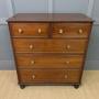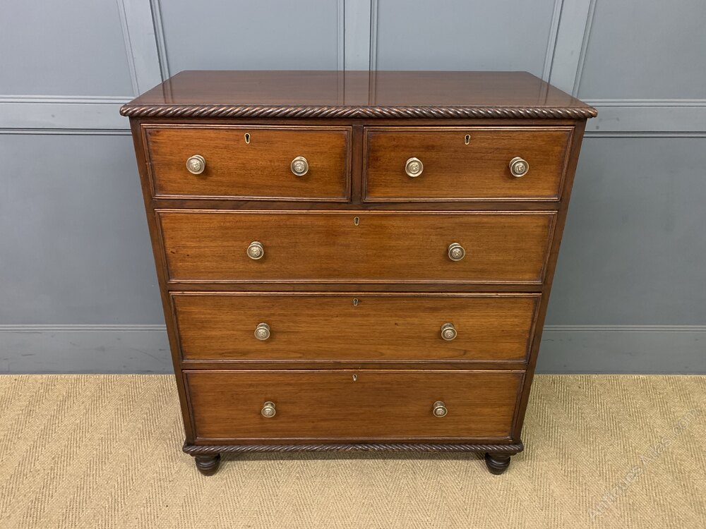 A good solid mahogany George IV period chest of drawers. With an arrangement of 2 short over 3 long graduated drawers. All fitted with their original charming brass handles. With gadrooning to the top edge and the skirt. Standing on charming turned bun feet. Sympathetically refinished in our workshops and now offered for sale in excellent condition, ready to go straight into the home.Dimensions:
