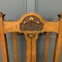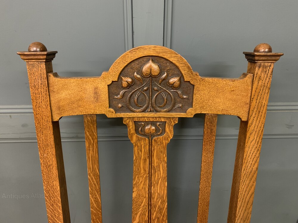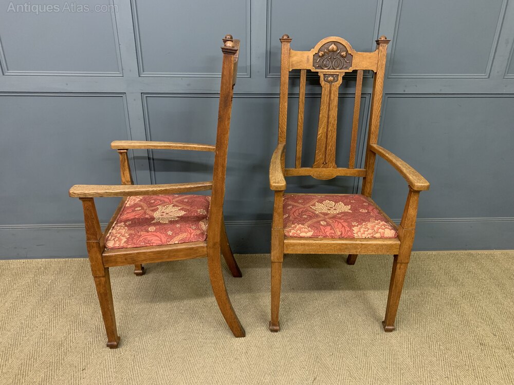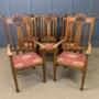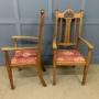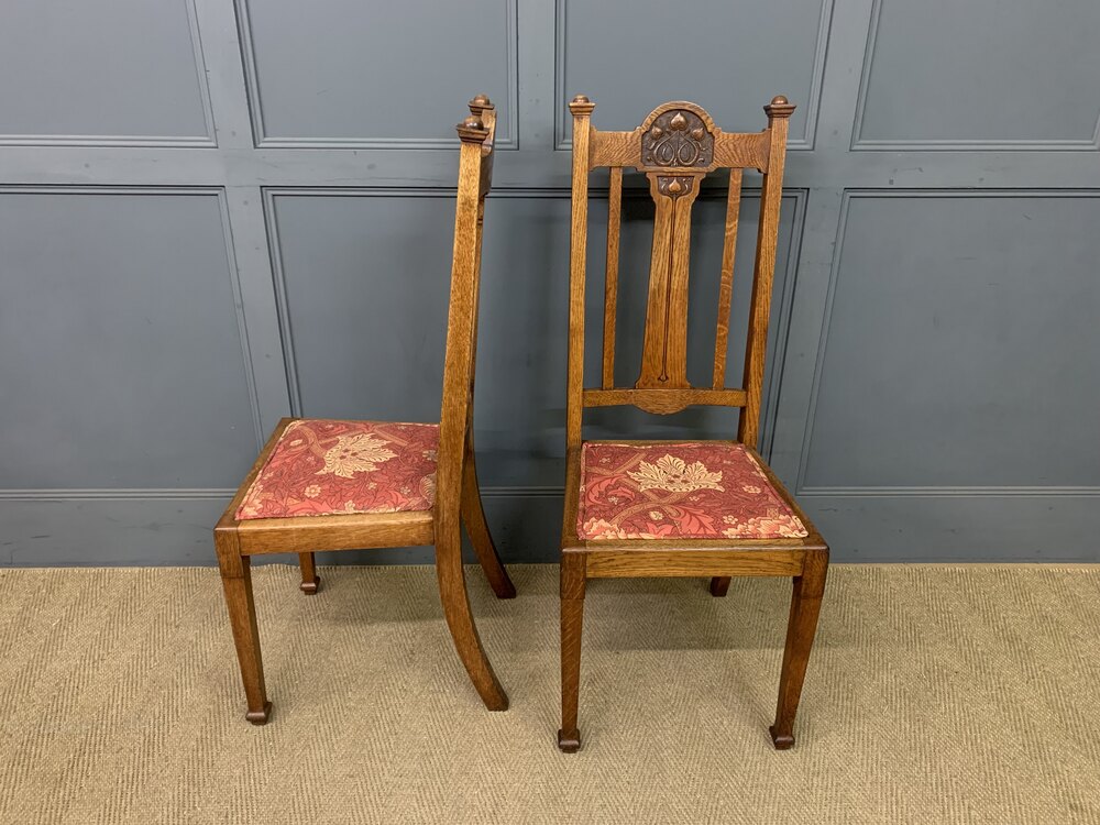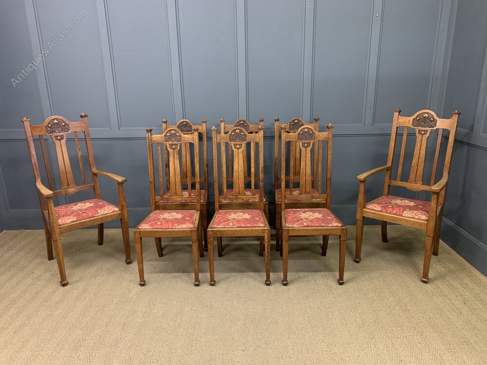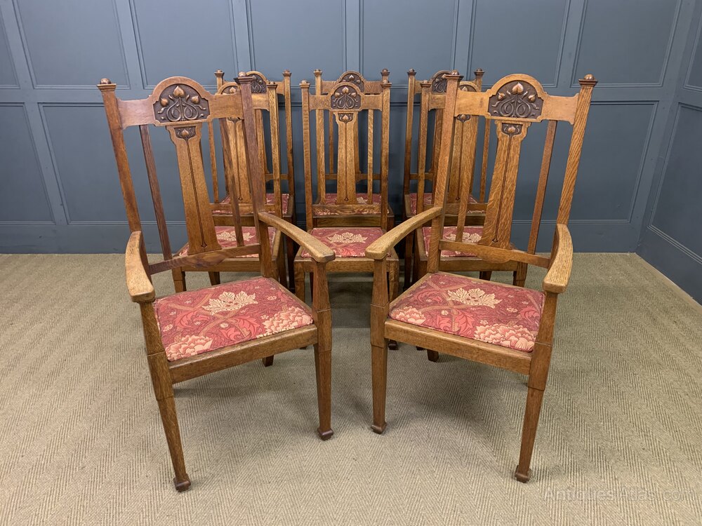 An excellent set of 8 Arts and Crafts period dining chairs, consisting of a pair of armchairs and 6 side chairs. Not stamped but probably by Shapland and Petter. Of good construction in solid English oak and upholstered in fabric redolent of the period. With stylised floral panels to the backs. Offered for sale in very good original condition with a good colour. Strong and sturdy and free from wobbles.Dimensions: