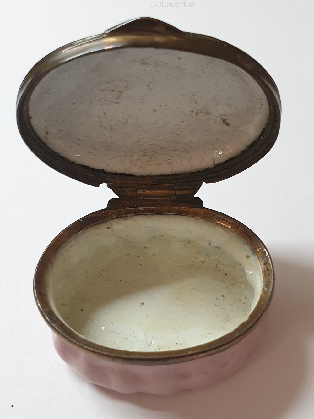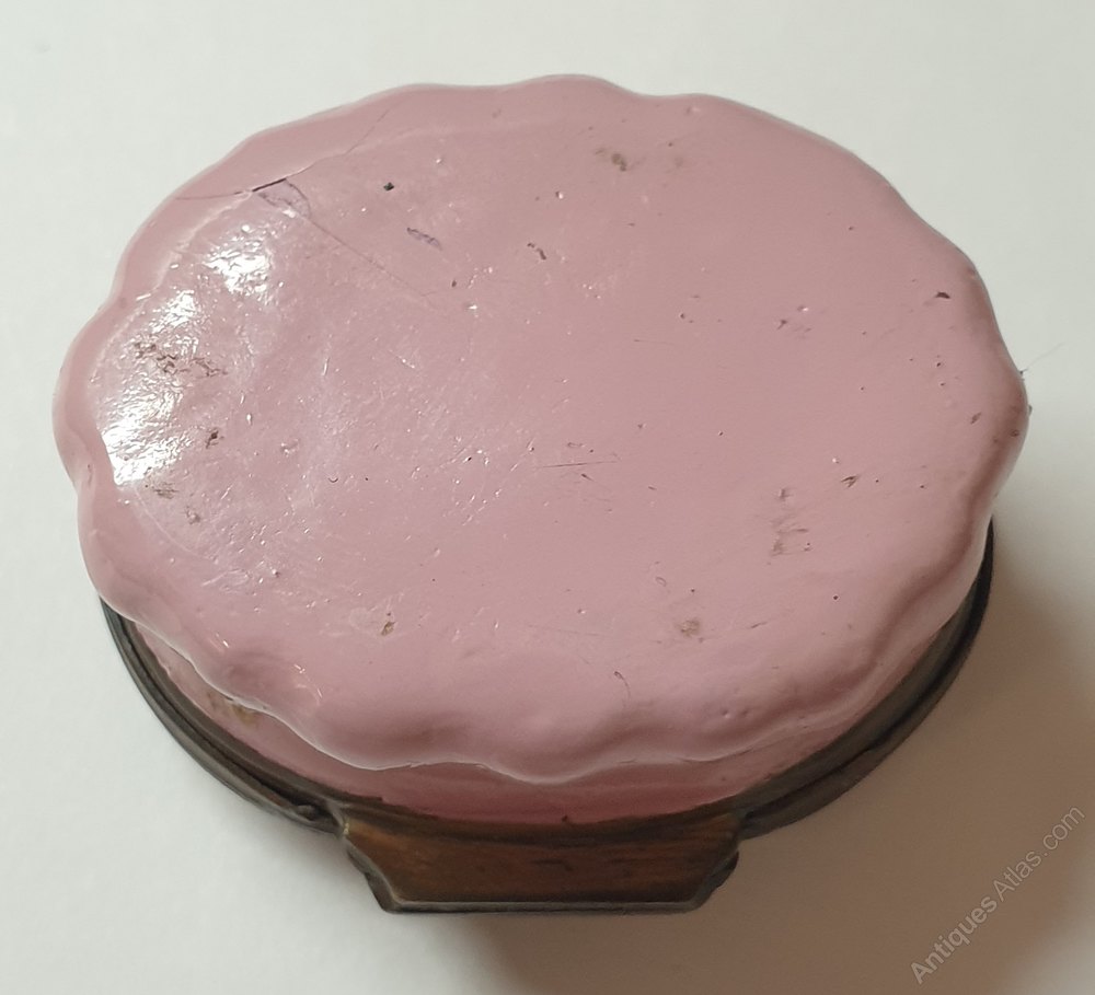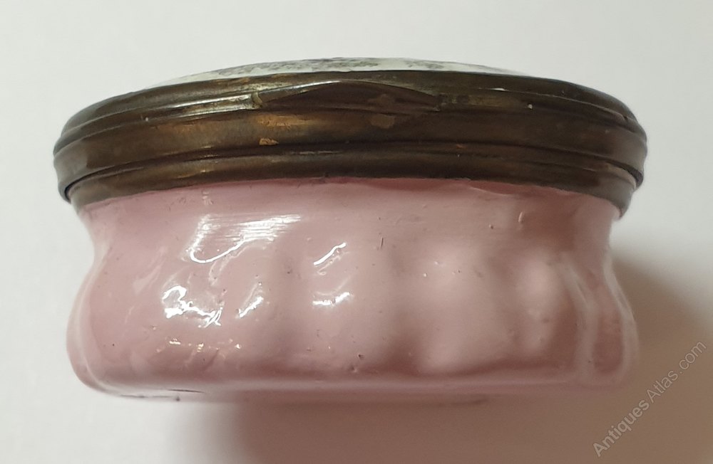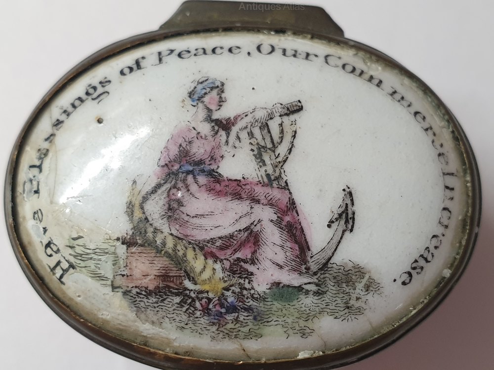 18th century South Staffordshire enamel patch box. Features a handpainted decoration of a lady with an anchor and a horn of plenty,with the inscription of "Have blessings of peace,our commerce increase" around the edge of the lid. Pink enamel base and brass edge and hinge.Some slight damage to the enamel decoration on the lid,hinge in working order. Measures 3.5cm x 3cm x 1 5cm. (D.K.C36)Date18th Century