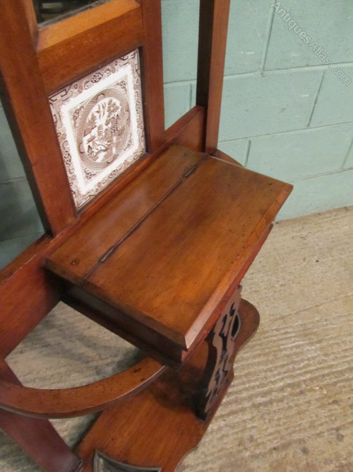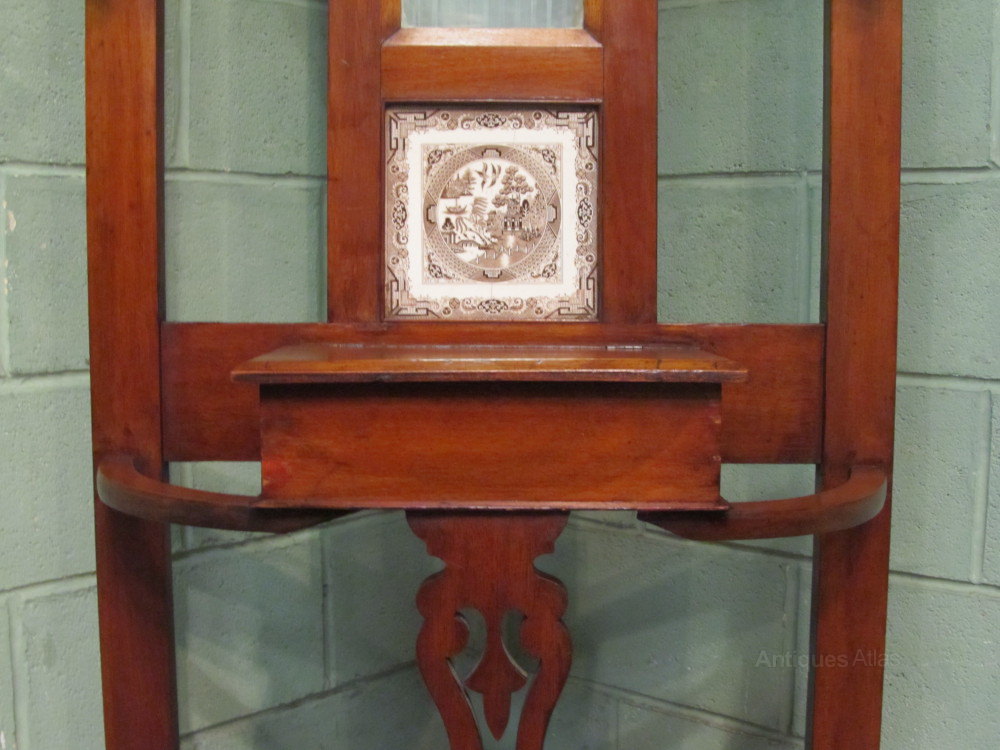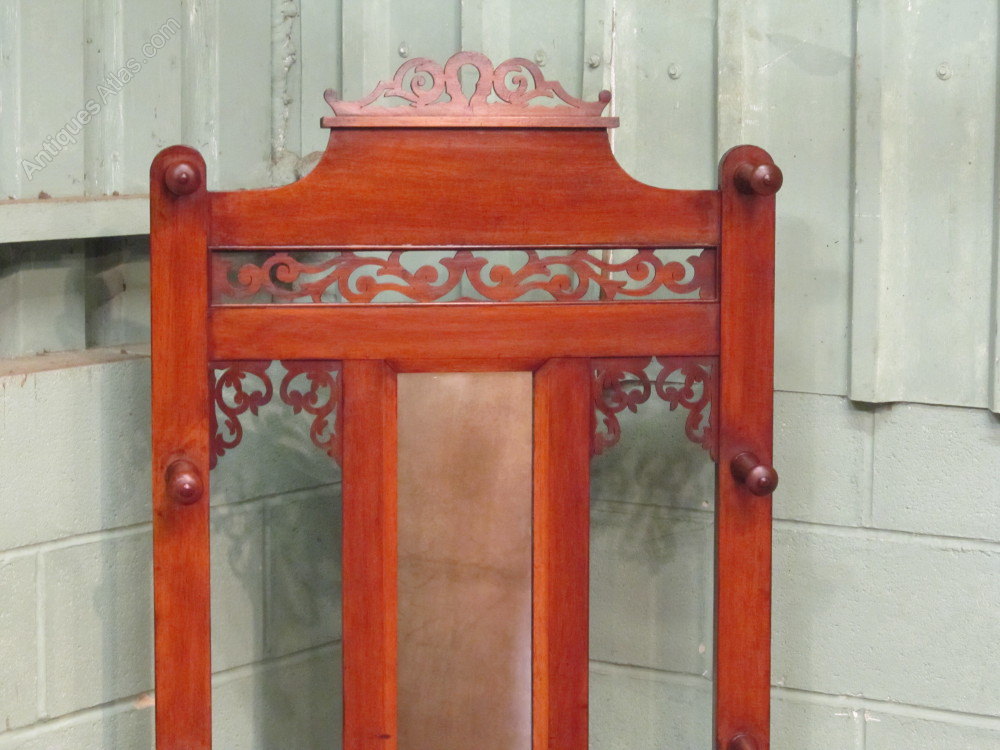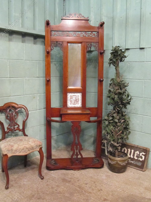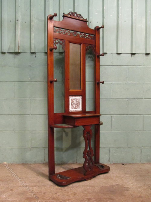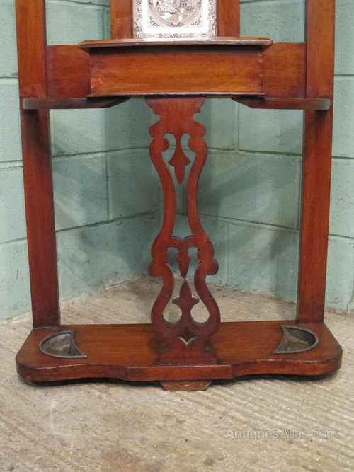 Antique Victorian Mahogany Hallstand and dating from around 1890. Constructed form quality mahogany it has a Pierced fretwork pediment to the shaped top above a pierced fretwork panel with central mirror and shaped fretwork frieze to either side and turned mahogany coat pegs. Below the mirror is an original willow pattern tile above a central glove box with stick supports on either side and above a lyre shaped central frieze support leading to a platform base with original drip trays. Stands on small bun feet.Measures 80" high x 11" deep x 30" wide