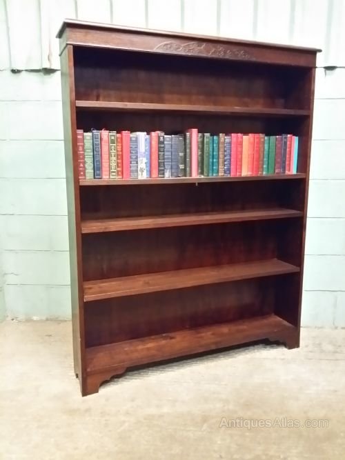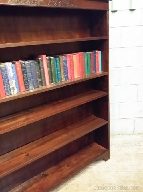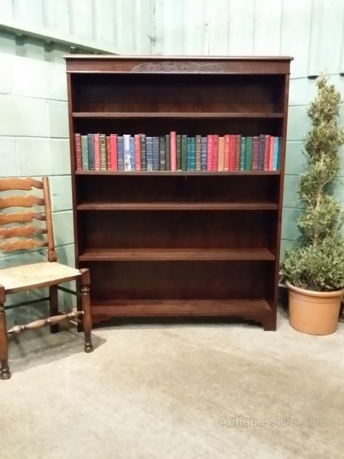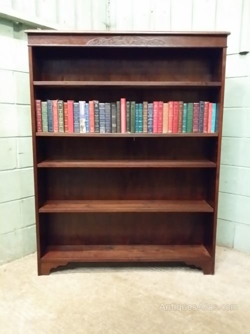 Antique Edwardian Oak Open Bookcase and dating from around 1900. Constructed from quality oak it has a moulded edge to the top with a wide frieze with a carved central panel. Below are four fully adjustable shelves. It stands on shaped bracket feet.Measures 63" high x 10.5" deep x 9" internal depth x 49.5" wide