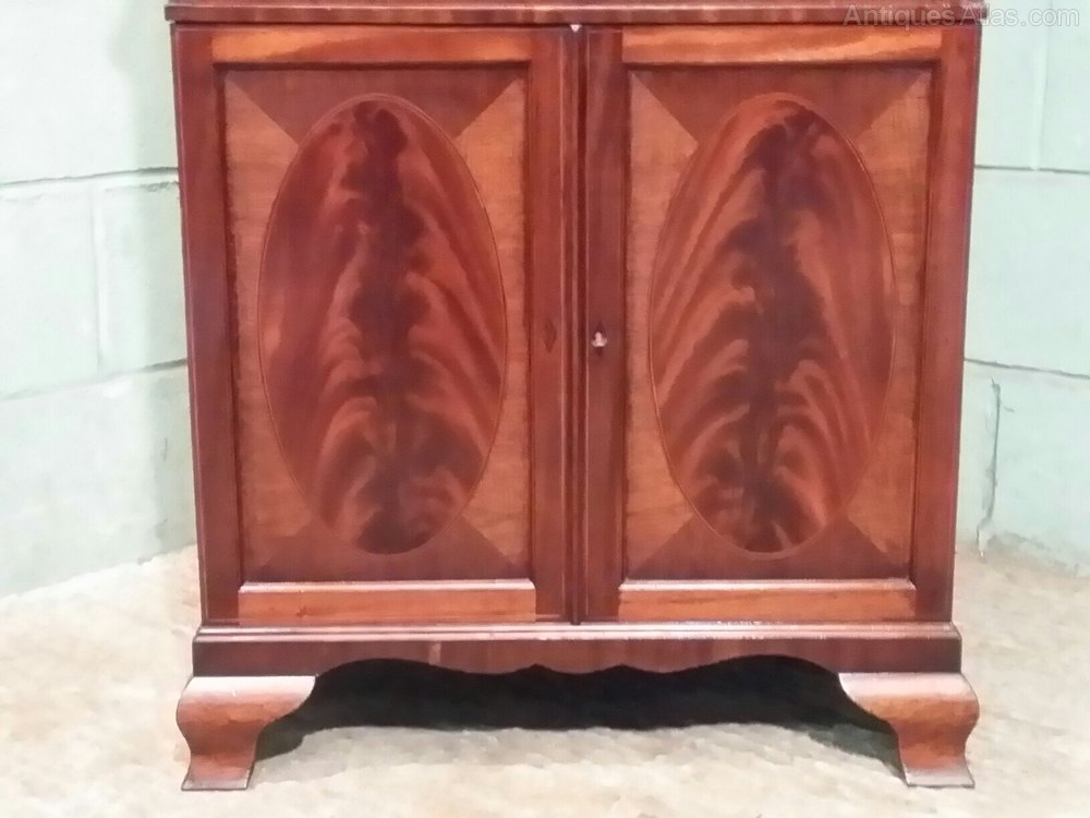 Antique Edwardian Flamed Mahogany Secretaire Cabinet and dating from around 1900. Constructed from quality mahogany it has a high gallery back with shelf to the top with inlaid stringing and shaped sides leading to a flamed mahogany fall front with brass handles and cross banded edges with fine stringing. This opens to reveal two long and two short drawers all of which have fine stringing and brass handles and sit above a central door flanked on either side by two pigeon holes.To the base there are two flamed mahogany doors with cross banded edges and oval panels to the centre with fine stringing and with escutcheon and working key. Internally there is a shelf. It stands on ogee bracket feet.