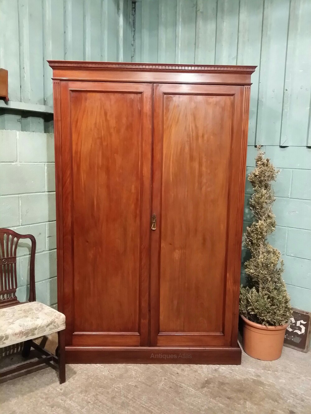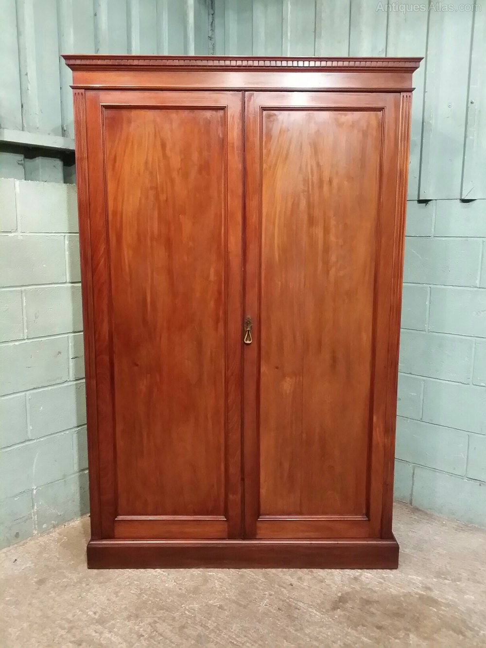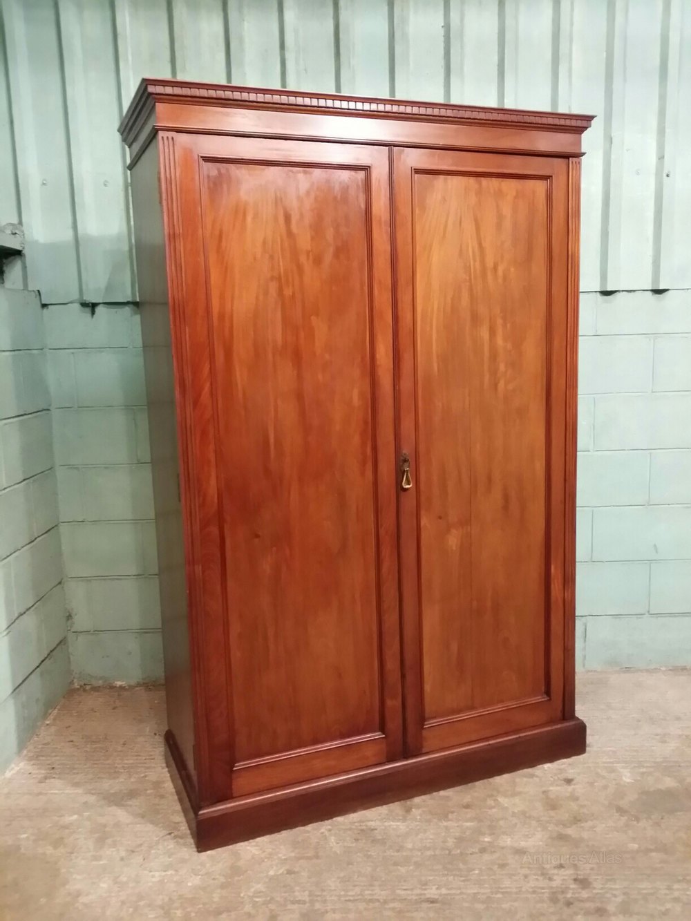 Antique Victorian Mahogany Double Wardrobe and dating from around 1880. Constructed from quality mahogany it has a cornice top with dental moulding above a deep cross banded frieze. There are two full length panelled doors with original brass handle and key. The doors are flanked on either side by a reeded column. Internally it is all hanging with brass rail and to the base there is a a sliding mahogany tray drawer above a long deep drawer with brass handles, it stands on a deep plinth base.Measures 80" wide x 22" deep x 52" wide and internal depth 19"