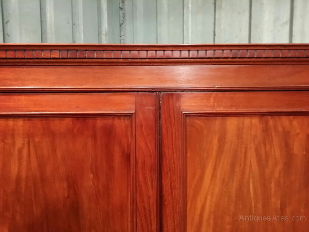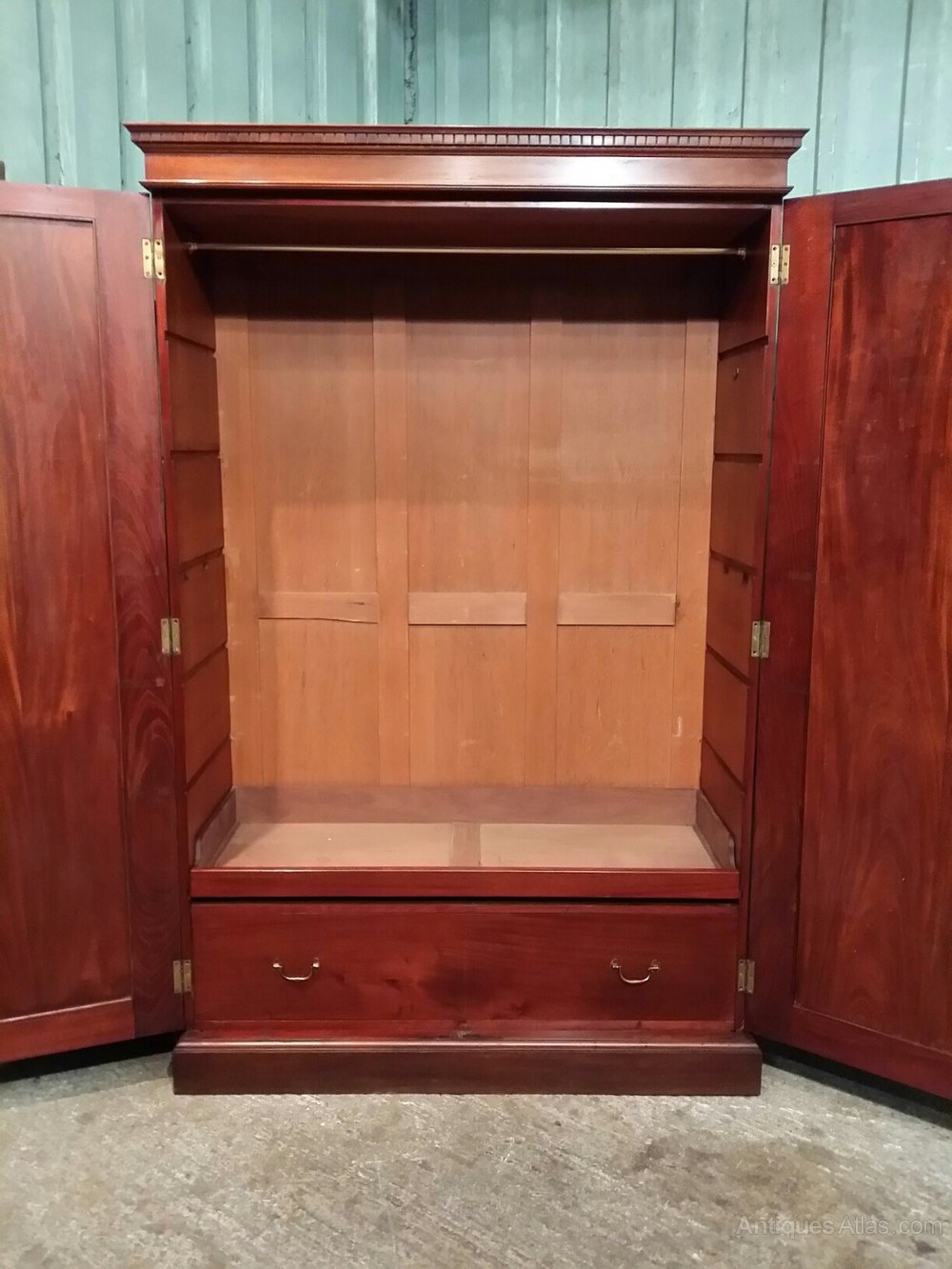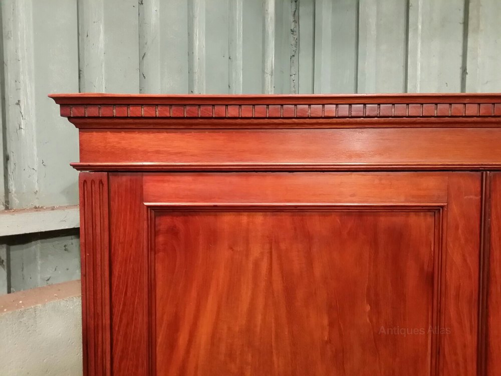 Antique Victorian Mahogany Double Wardrobe and dating from around 1880. Constructed from quality mahogany it has a cornice top with dental moulding above a deep cross banded frieze. There are two full length panelled doors with original brass handle and key. The doors are flanked on either side by a reeded column. Internally it is all hanging with brass rail and to the base there is a a sliding mahogany tray drawer above a long deep drawer with brass handles, it stands on a deep plinth base.Measures 80" wide x 22" deep x 52" wide and internal depth 19"