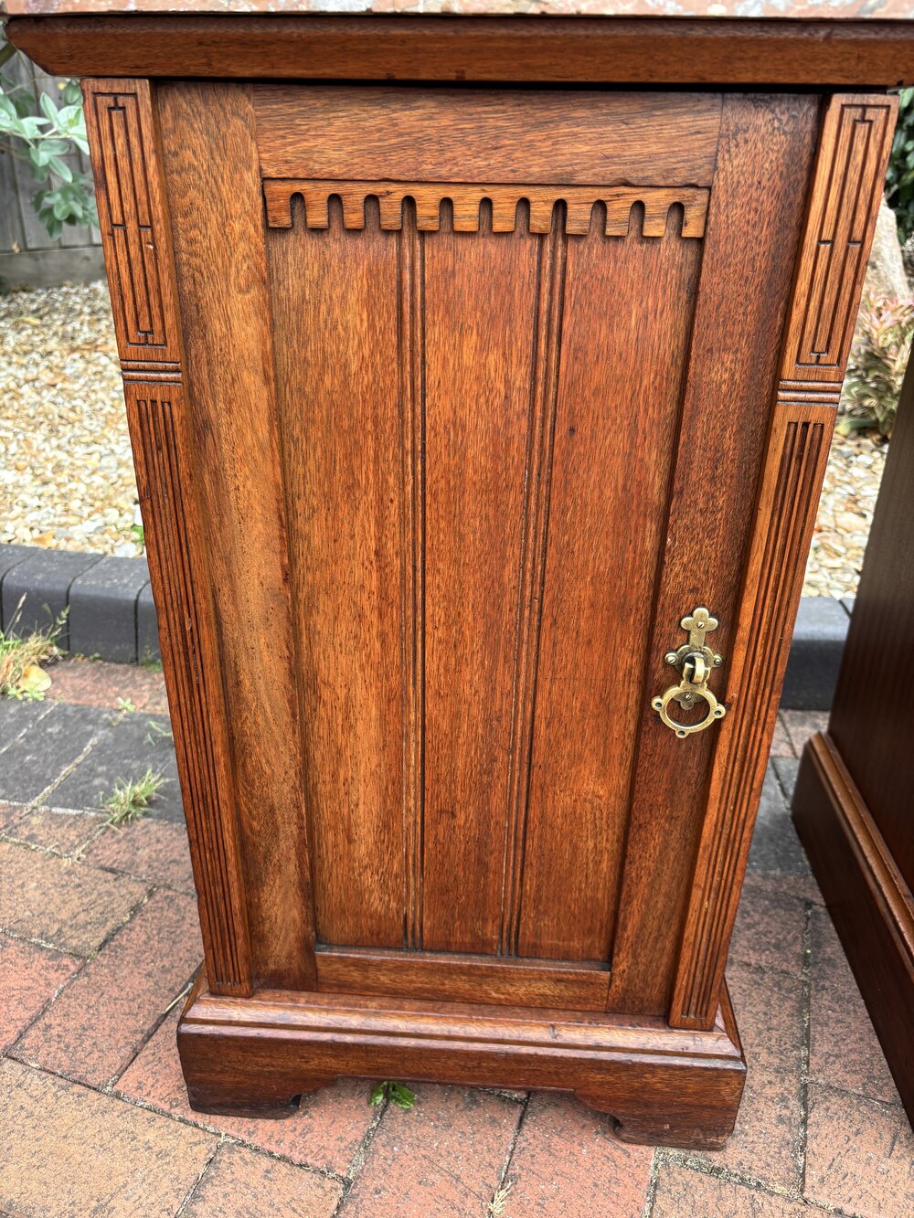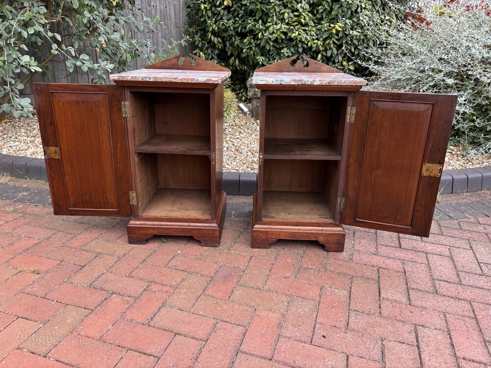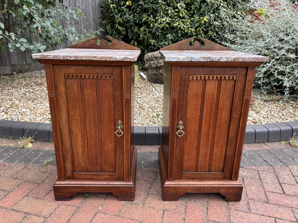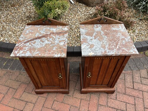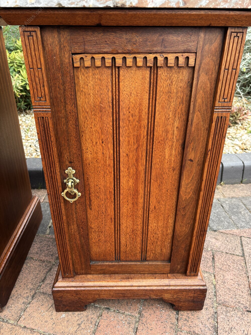 A good looking pair of Victorian bedside cabinets, made of walnut with a shaped gallery back and marble tops.Panelled doors with brass drop handles, single shelf to the interior, reeded side supports and stands on bracket feet.