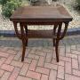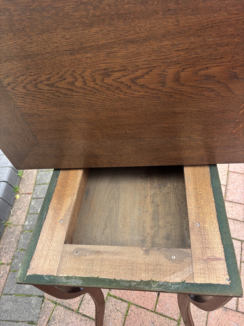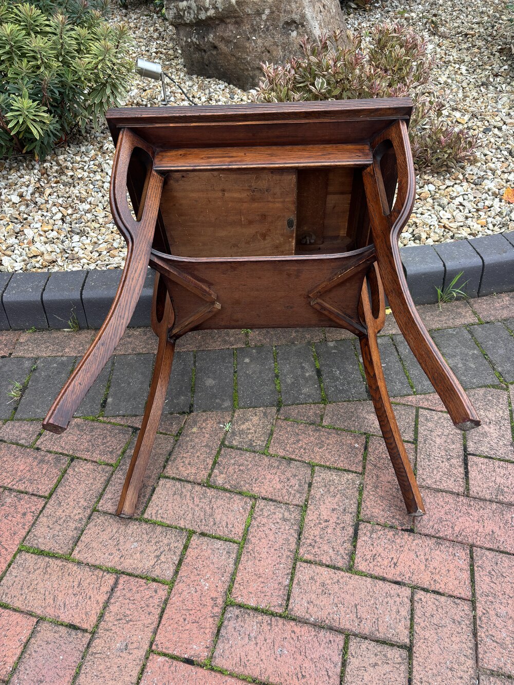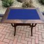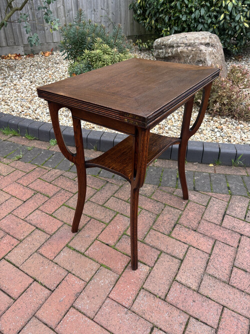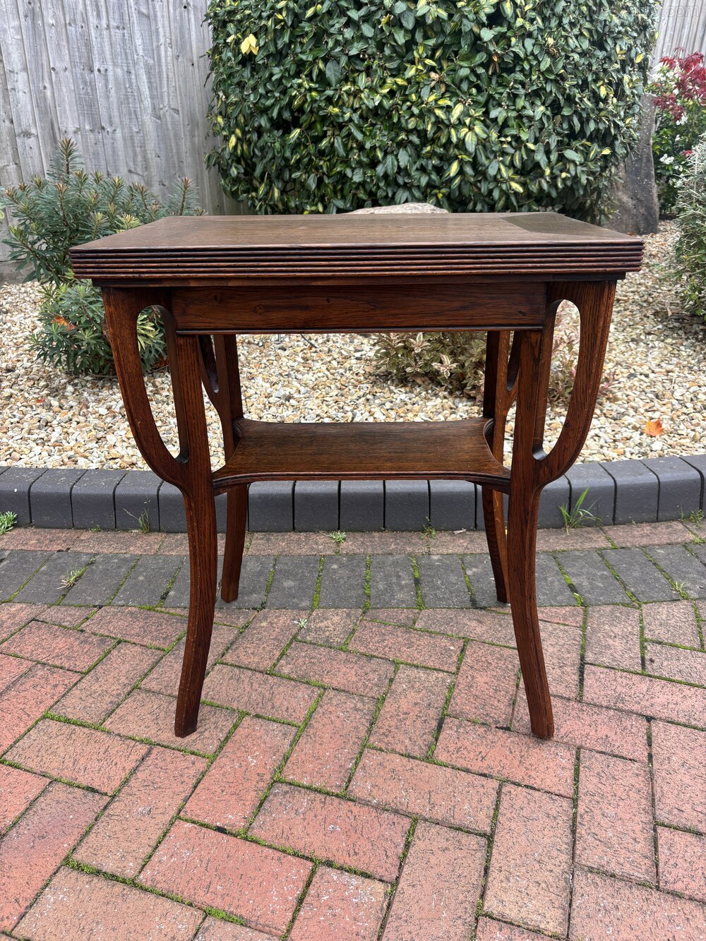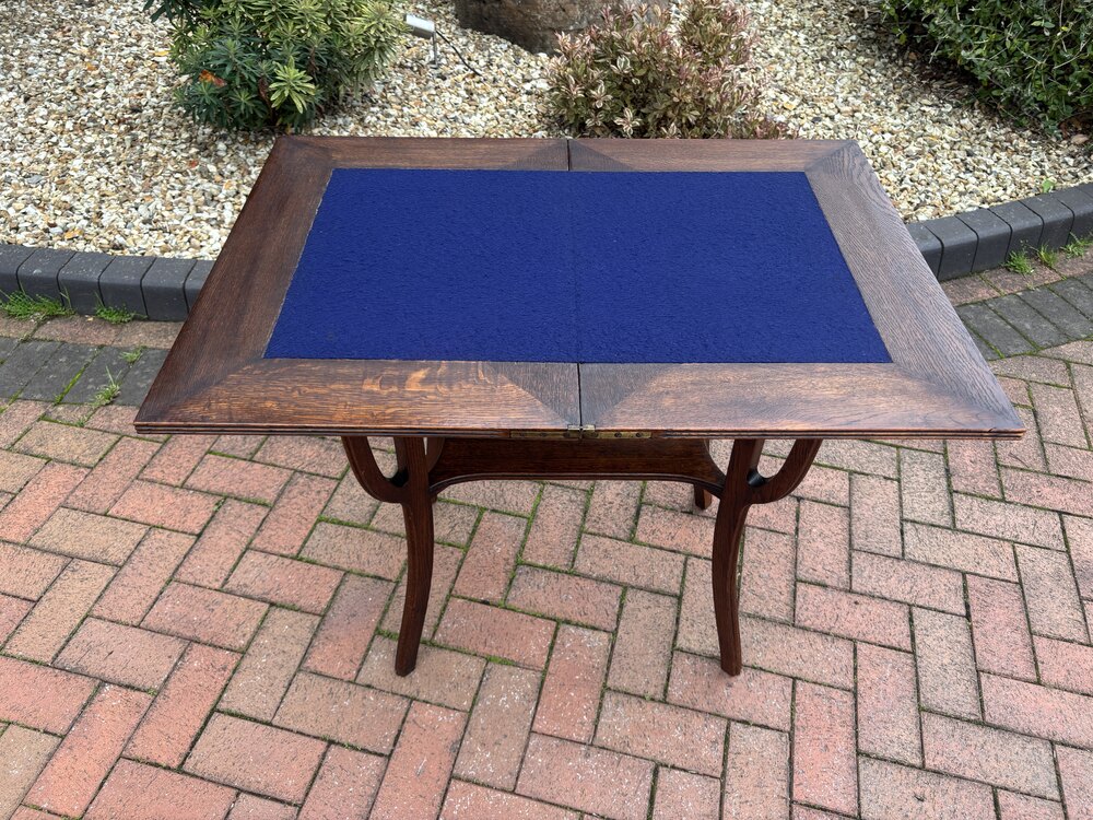 A German art nouveau occasional / card table made of solid oak c1895. The table is very useful as an occasional table, but when required the top opens out to become a card/games table, with a blue baize top and an underbox for cards and counters. Decorative in shape with its curved corner brackets, an under shelf and stands on splayed legs.There is a metal plaque to the underside with the german patent 'Gesetzlich Geschutzt".