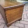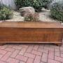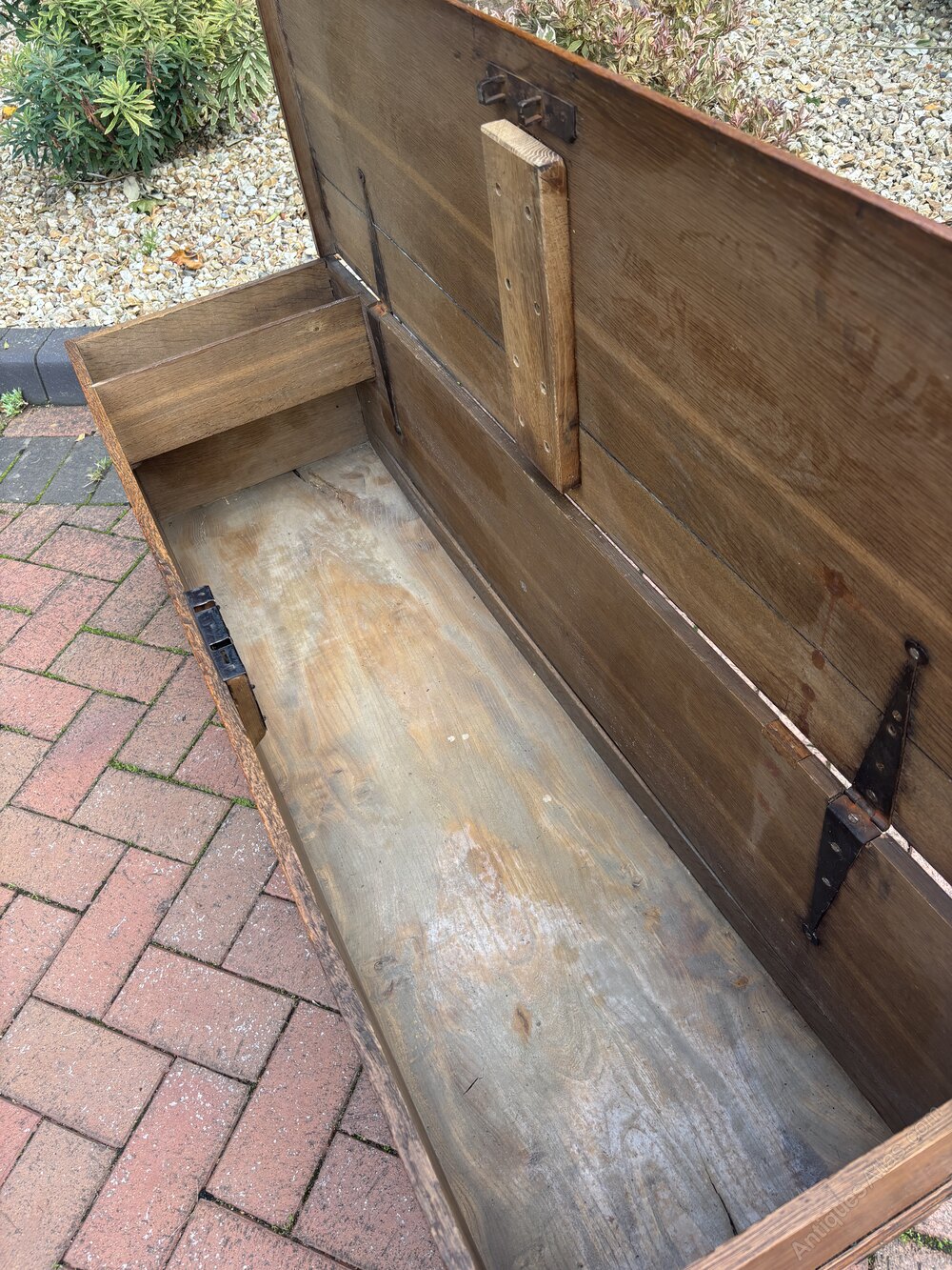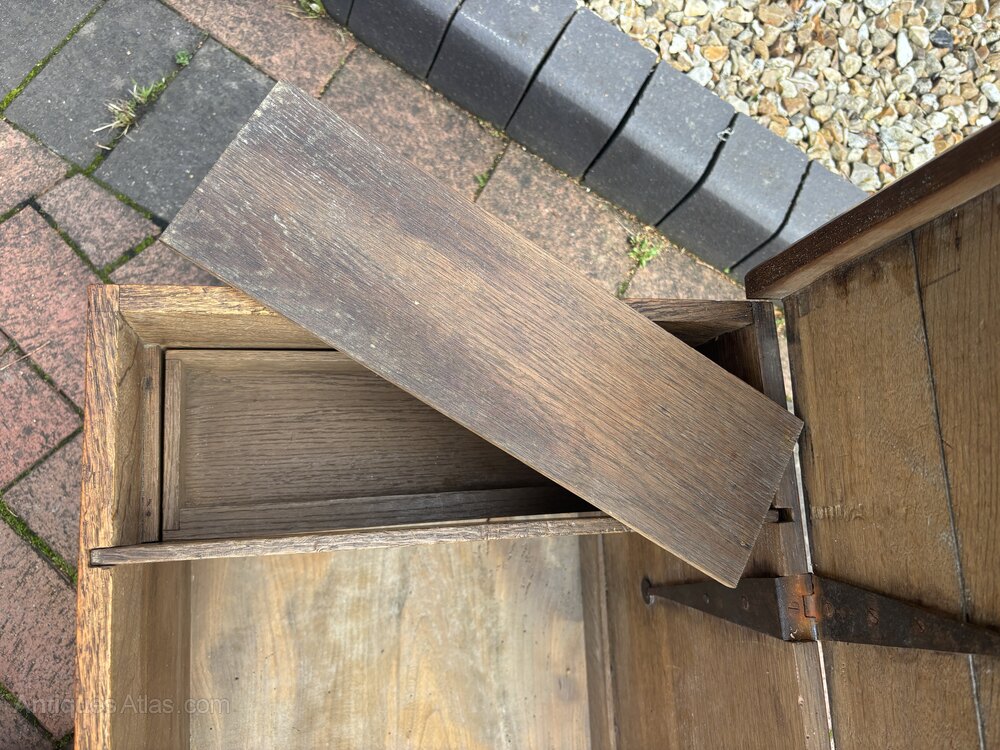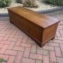 A long solid oak late georgian blanket box c1830. Good size, having a hinged lid with steel strap hinges, which opens to reveal ample storage space, lidded candle box, a secret under-shelf, and stands on bracket feet. Original lock but no key.The blanket box is the same height as a normal seat of 17 inches, so could be used as a hall bench or end of bed seat.