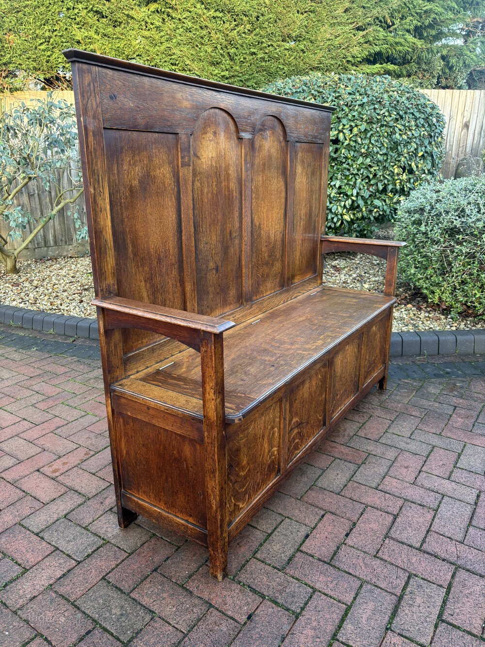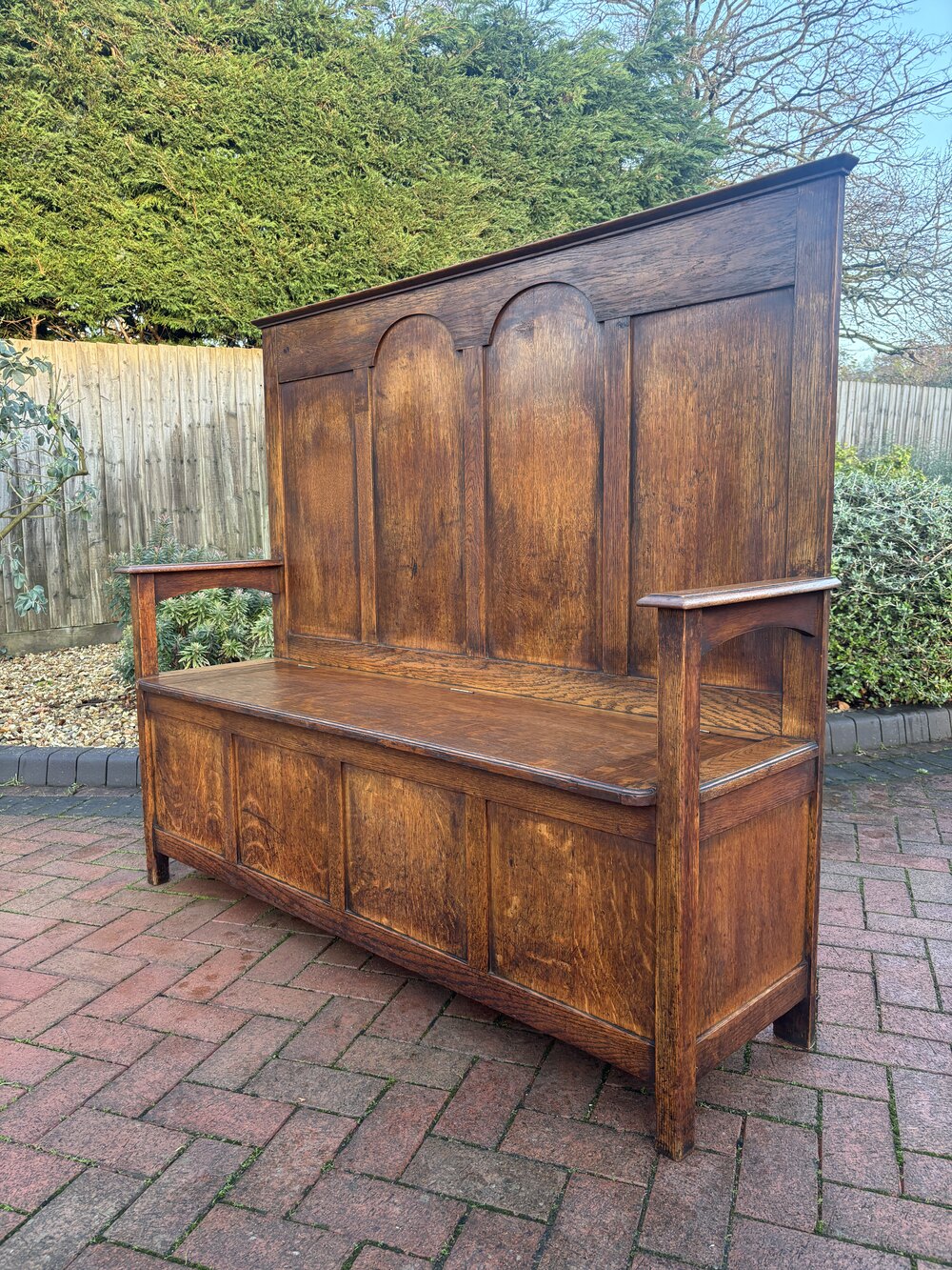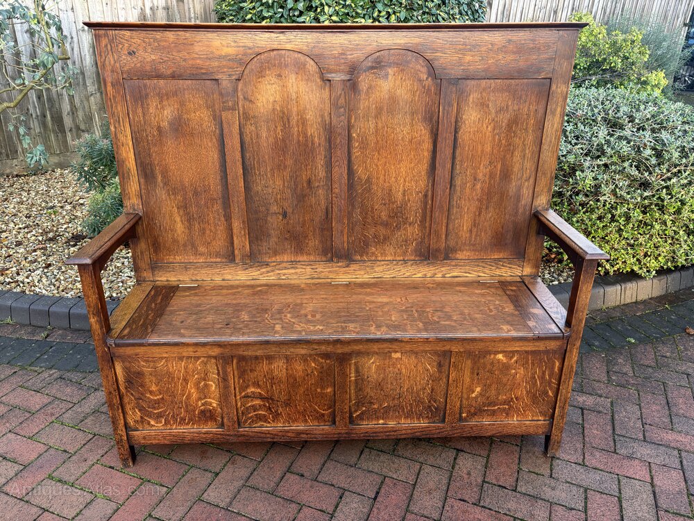 An Arts & Crafts solid oak settle/hall seat, having arched detail to the centre, lift up seat with large storage space below and underarm arched supports.In very good overall condition.