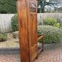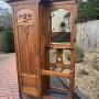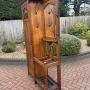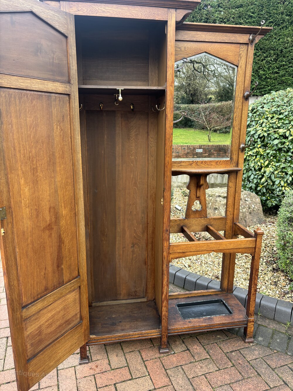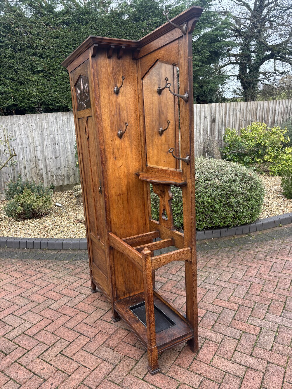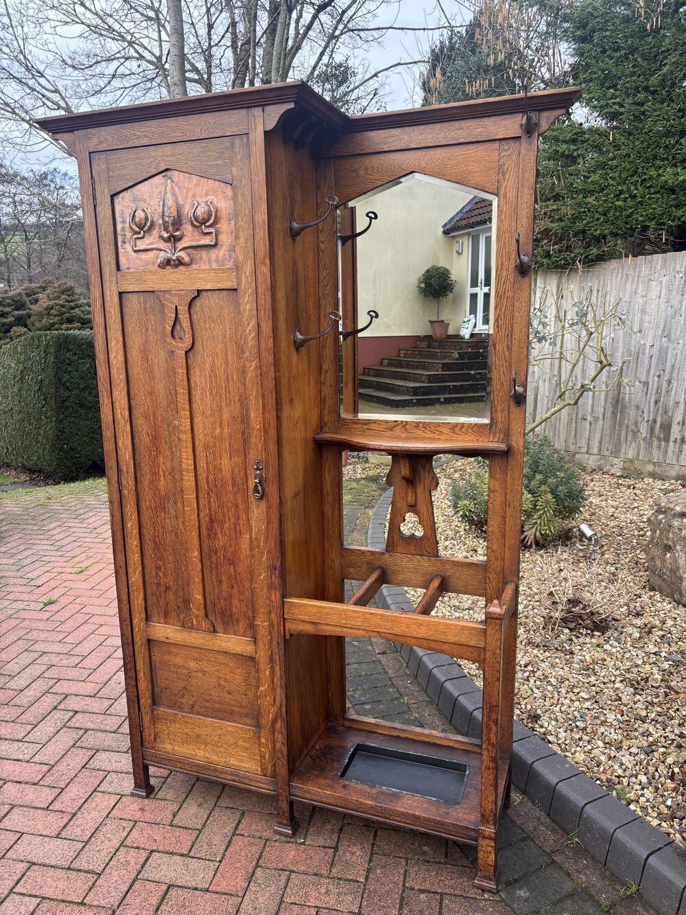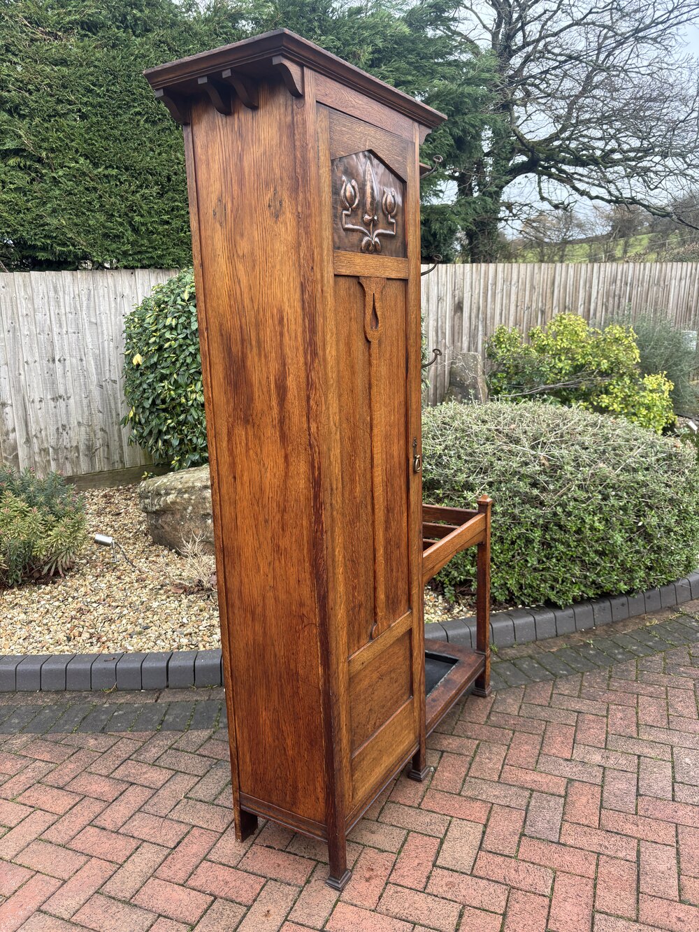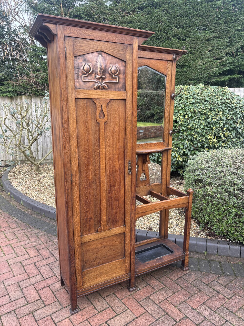 A very useful Arts & Crafts solid oak hall stand with robe cupboard. Overhanging top with shaped side supports, with a full length panelled cupboard featuring an inverted heart design to the front, original brass door handle and anodised copper panel. The interior has coat hooks and storage shelf above. The exterior has five matching original coat hooks, original shaped bevelled edge mirror plate, small shelf with cut-out support over a division stick stand with original drip trays, and stands on pad feet.In good condition.