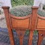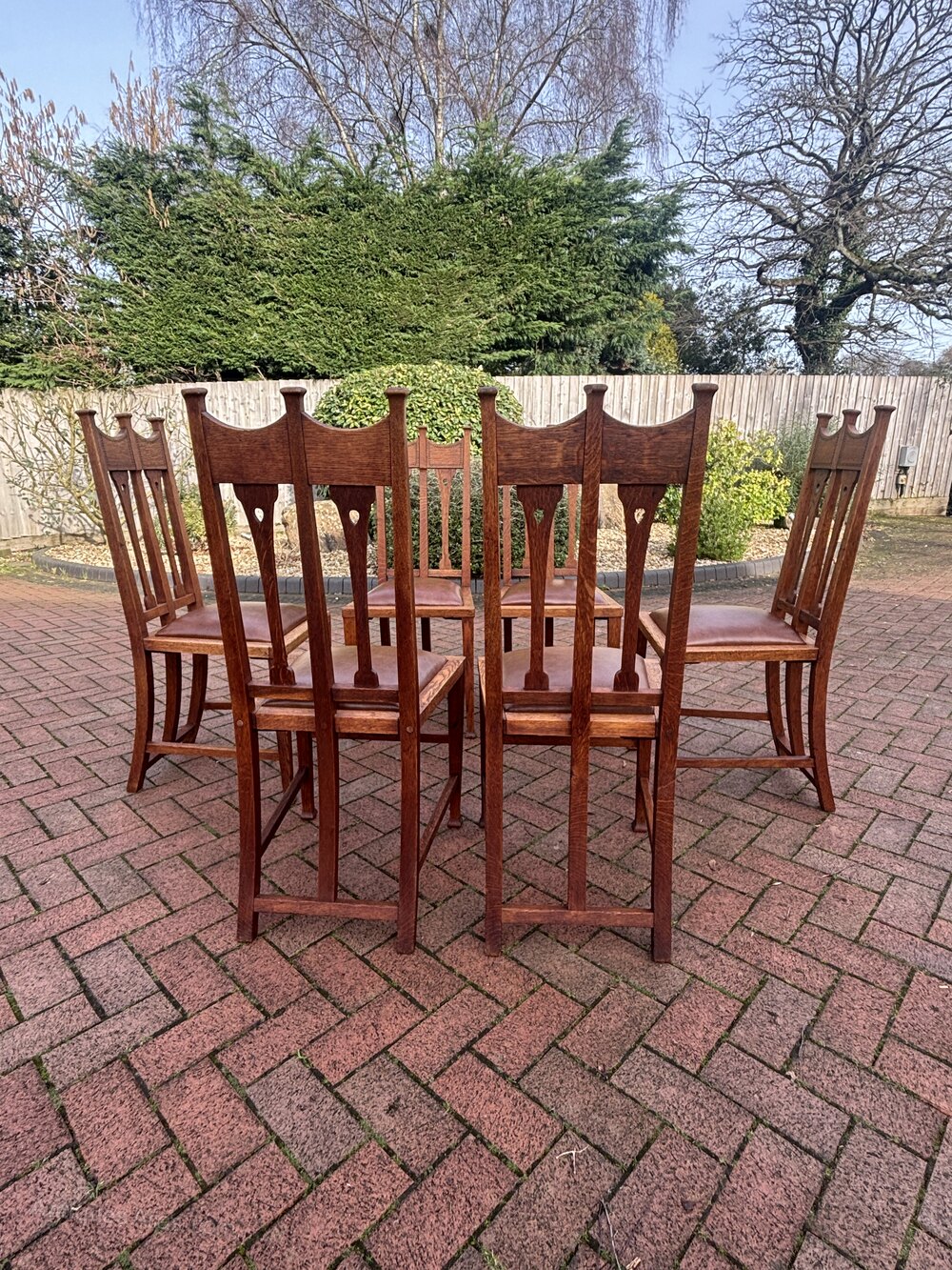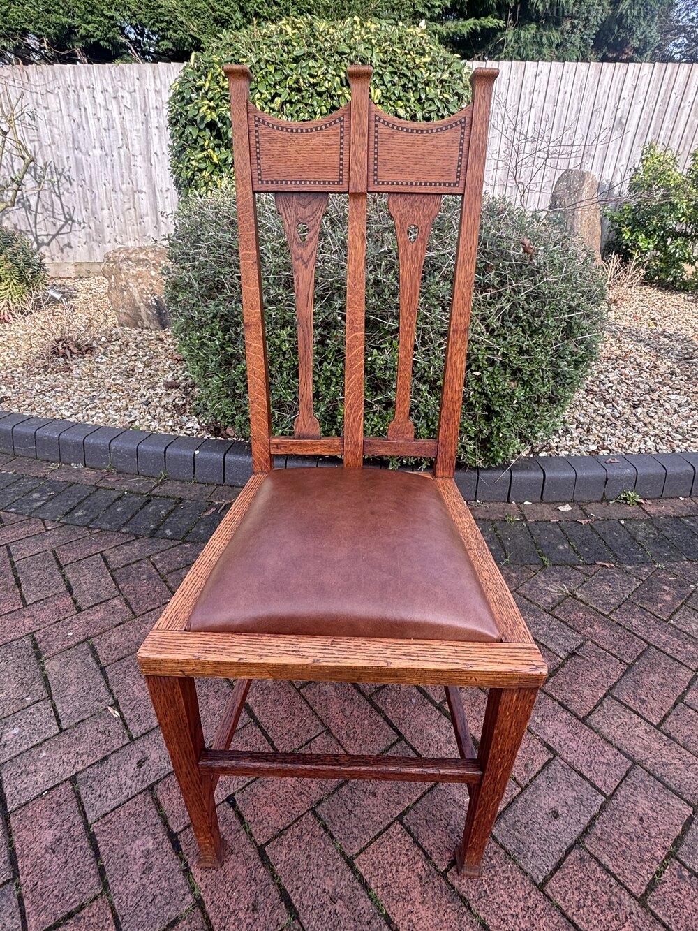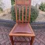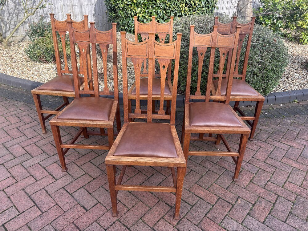 Set of six Arts & Crafts solid oak dining chairs attributed to George Montague Ellwood. The top rail has ebony and boxwood inlay between capped columns. Cut-outs to the back slats, sweeping back supports and stands on tapering legs.Newly and fully upholstered removable seat pads to include new webbing, and upholstered with new leather.