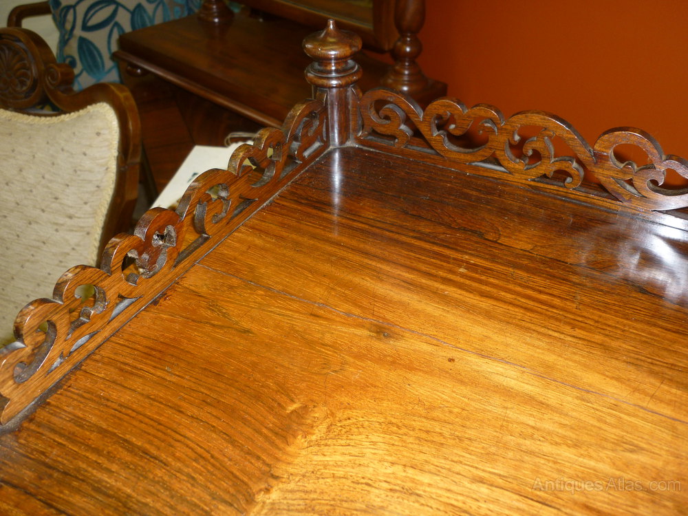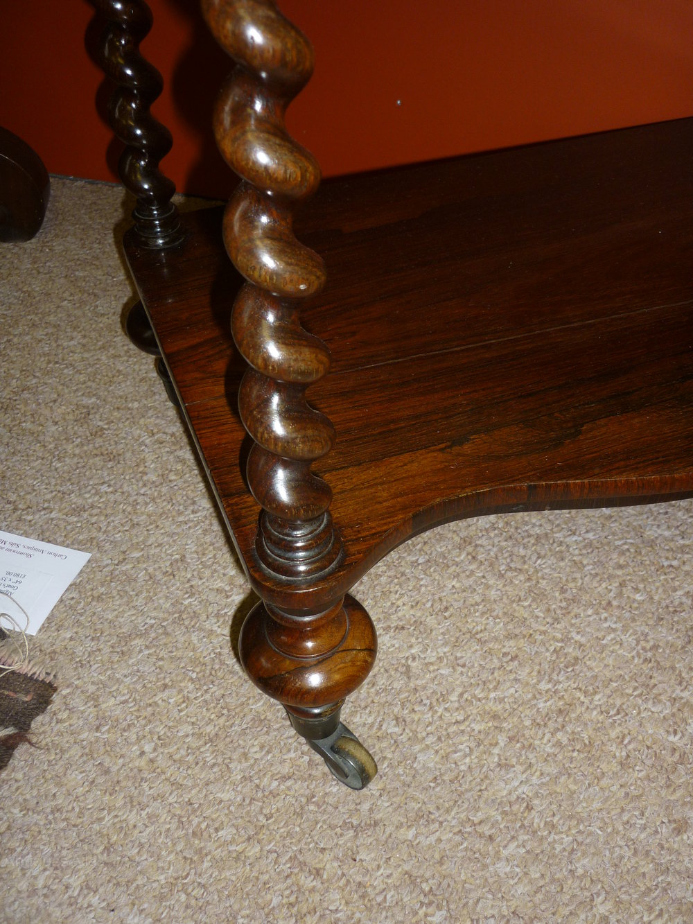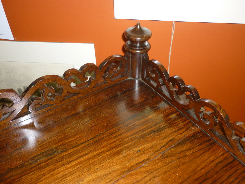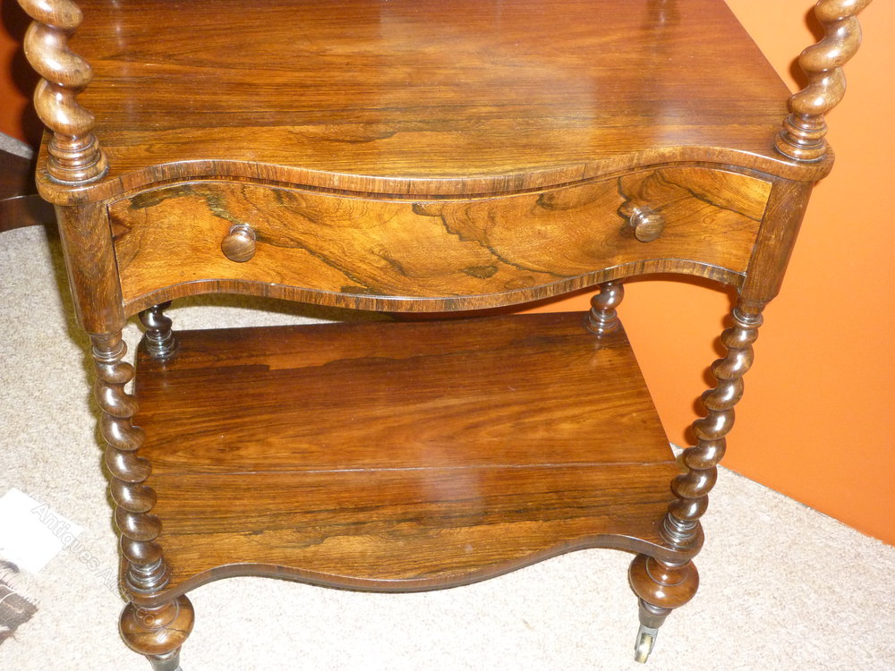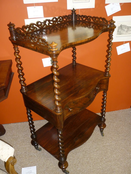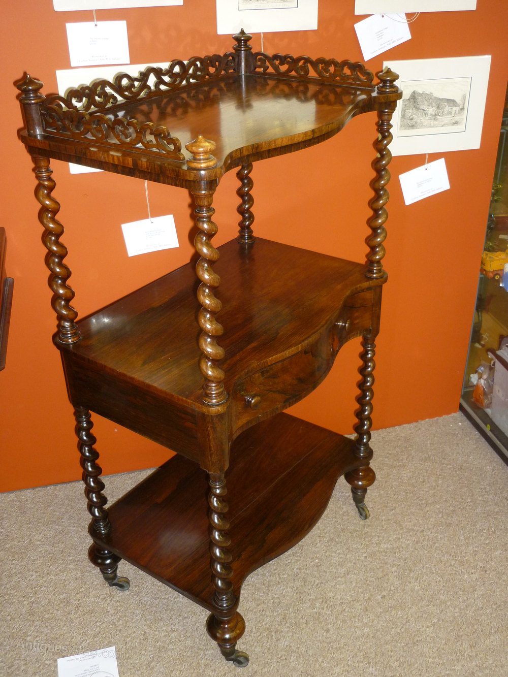 Victorian rosewood 3 tier What not with draw, turned supports, pierced fret work rails with turnings, turned legs onto caster. draw on centre. the what not has under gone light restoration, fret work repairs in areas, there is a crack in top and bottom shelves which have been repair and filled.DateLate 19th Century :