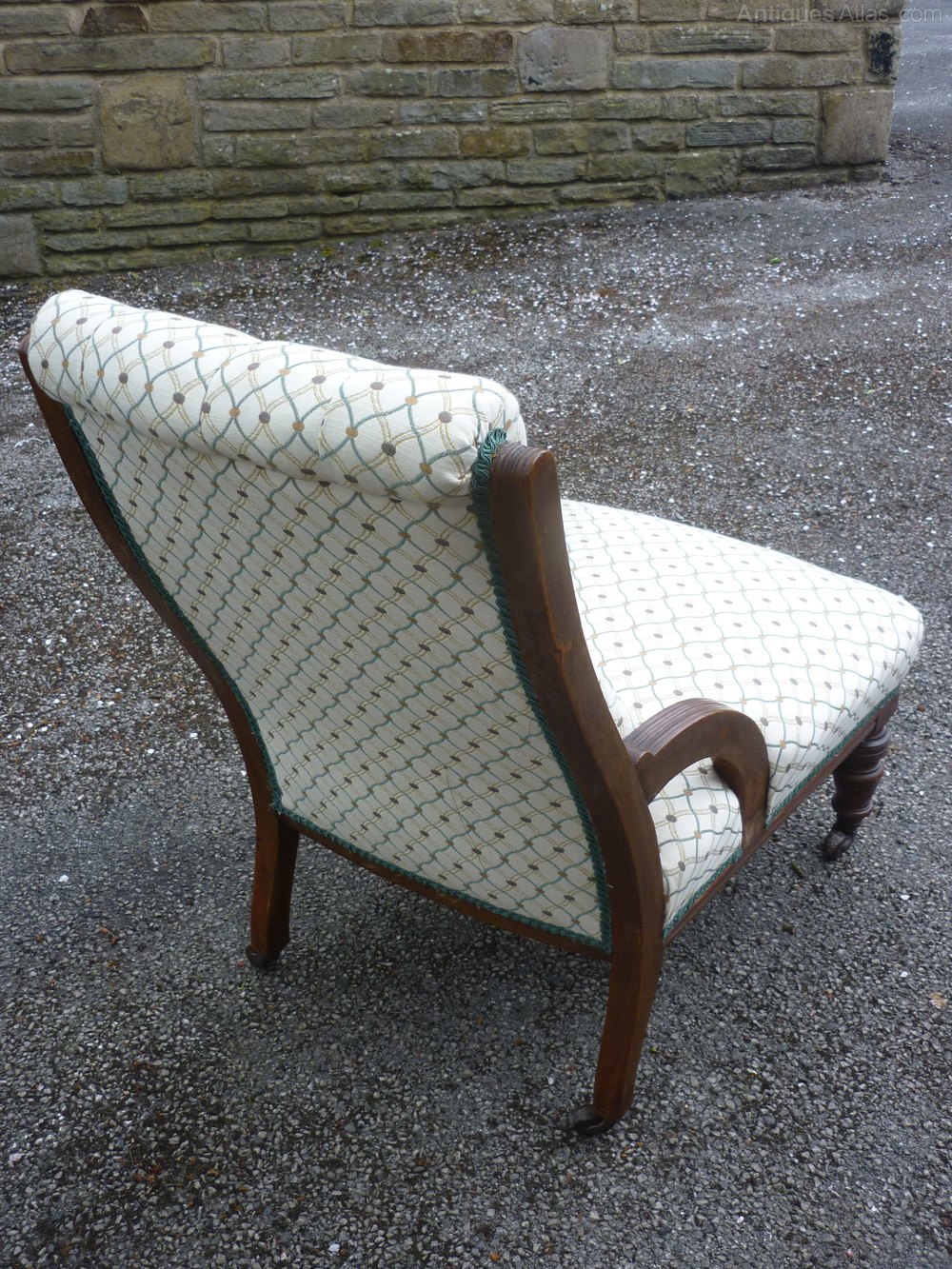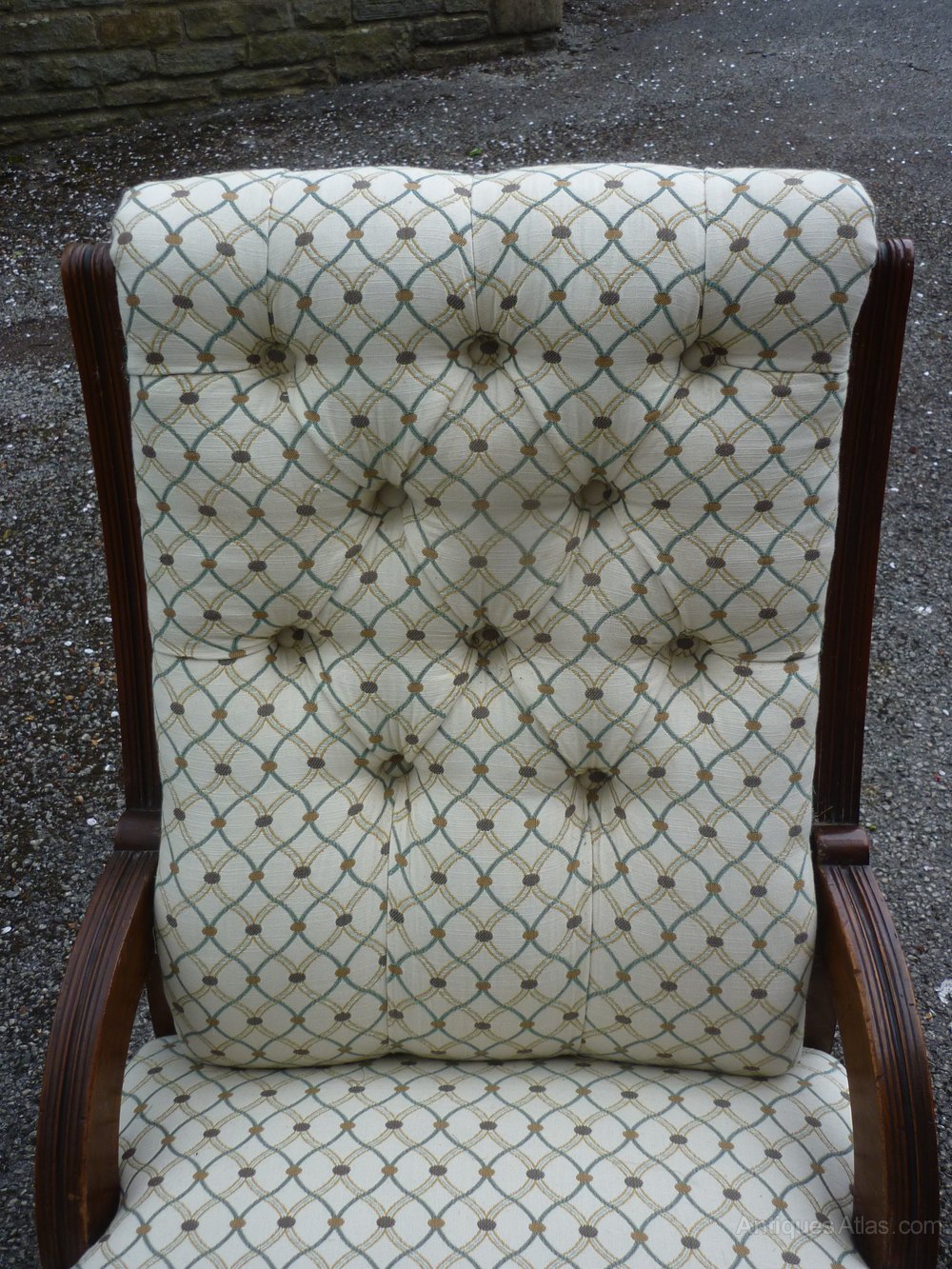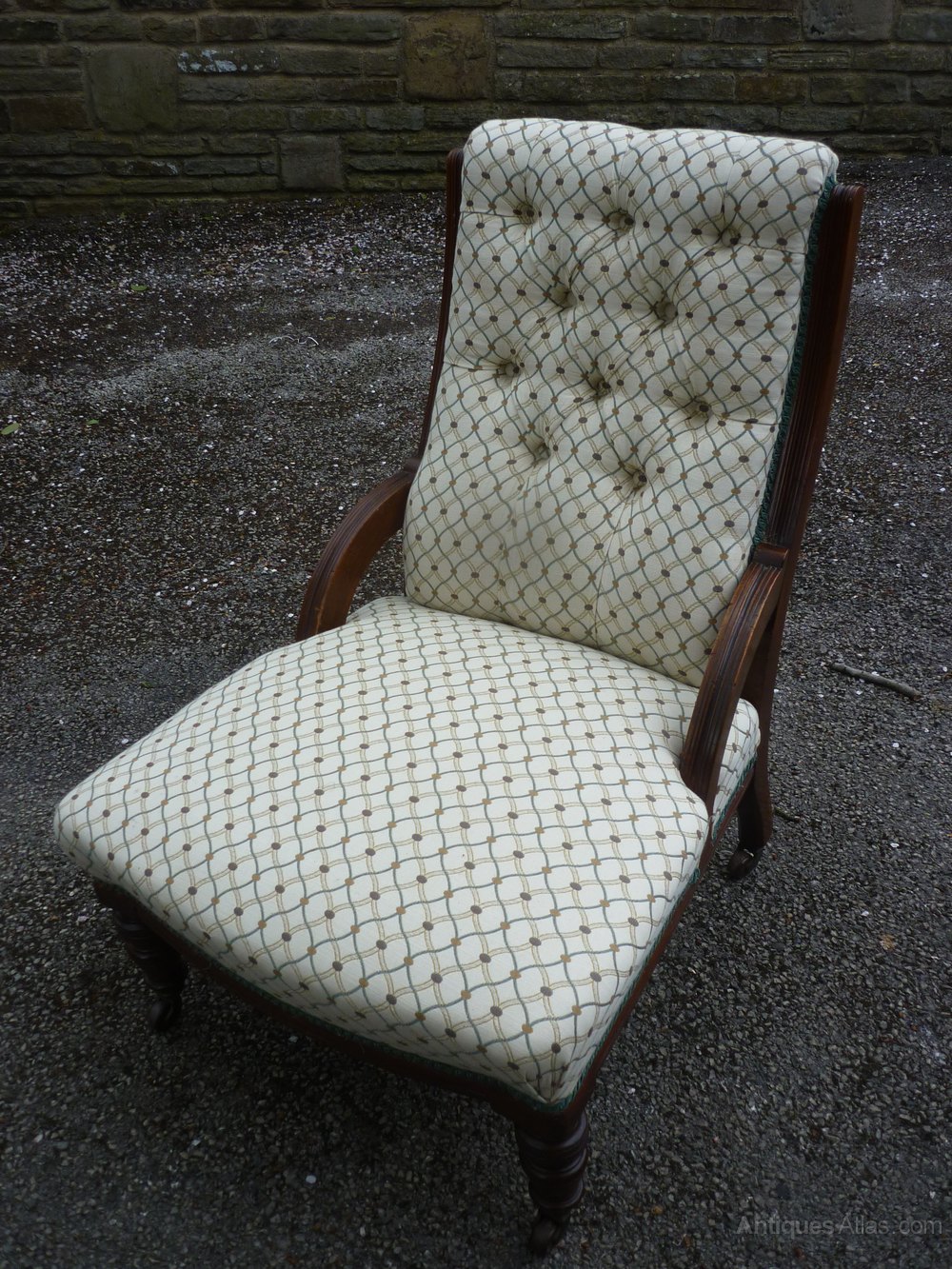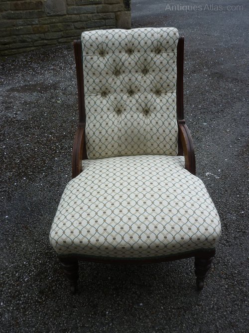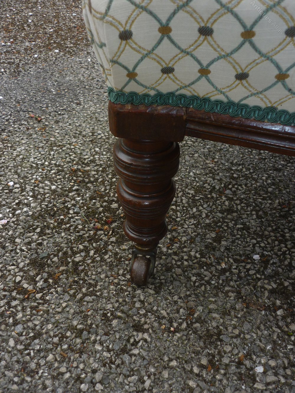 A late Victorian salon ladies nursing chair, made from mahogany on turned legs with original casters. Now fully re-stored and re-upholstered, using traditional materials and techniques. Hand sprung seats using coil springs and all stuffed with horse hair which has been stitched in to place. Deep button back, finished in the 1920's style fabric which is cream with a blue/ green design.Lots of chairs and sofas in stock, why not choose your chair and have use restore it for you.