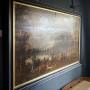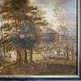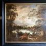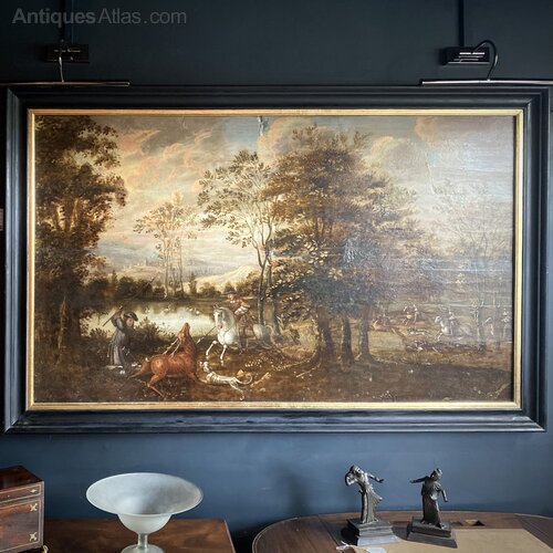 The scene features a stag being hunted in the foreground left, surrounded by a horse and hound. While a pack of hounds in the background right close in on a second. An idyllic landscape alongside the waters edge polarises the chaotic and rather brutal scene, making for quite a striking statement piece.