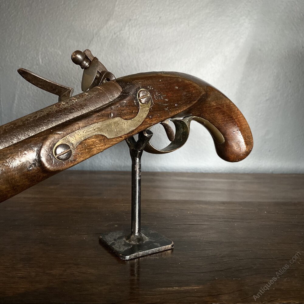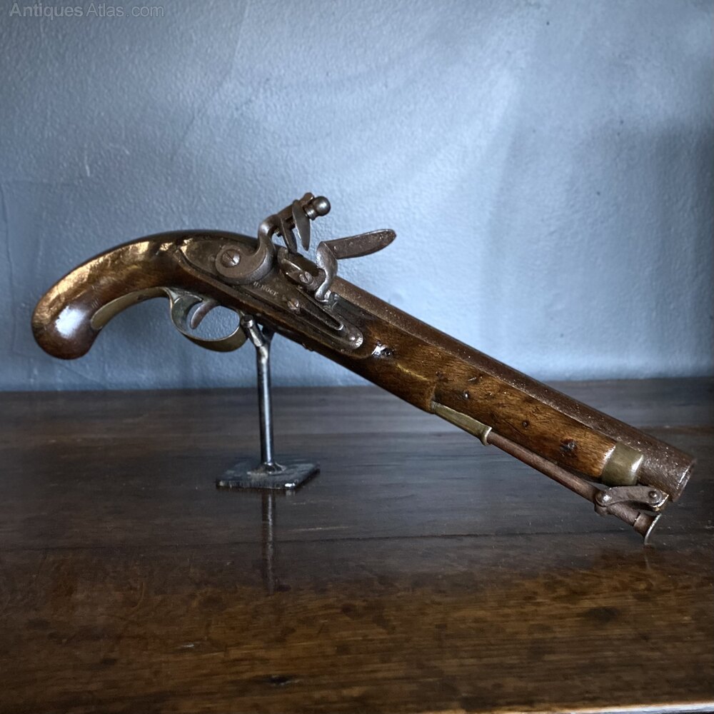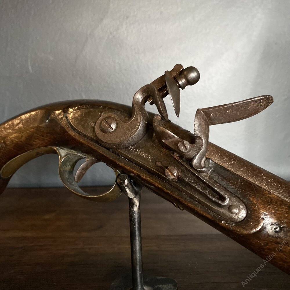 A very fine flintlock muzzle loading pistol, by Gunmaker in Ordinary to King George III, Henry Nock. Circa 1775.This superb example wears a bordered lock plate, engraved 'H.Nock'. Mounted over a mahogany stock, with brass detail on the opposite side. Underneath is a brass trigger and trigger guard, in front of which sits a captive ramrod.