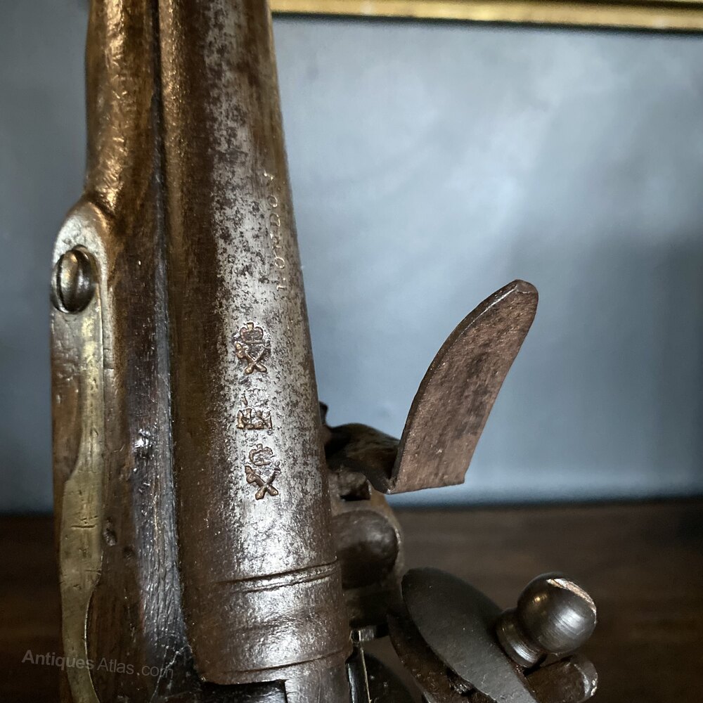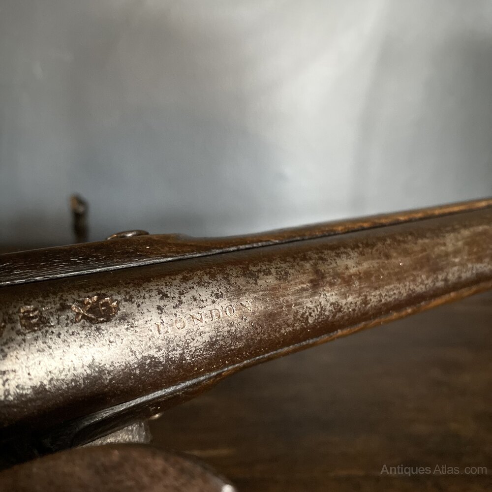 The barrel is stamped with proof and manufacturer marks to one side, with 'London' at the top centre of the barrel. Mechanisms are all in strong working order. Barrel is 37cm in overall length.