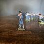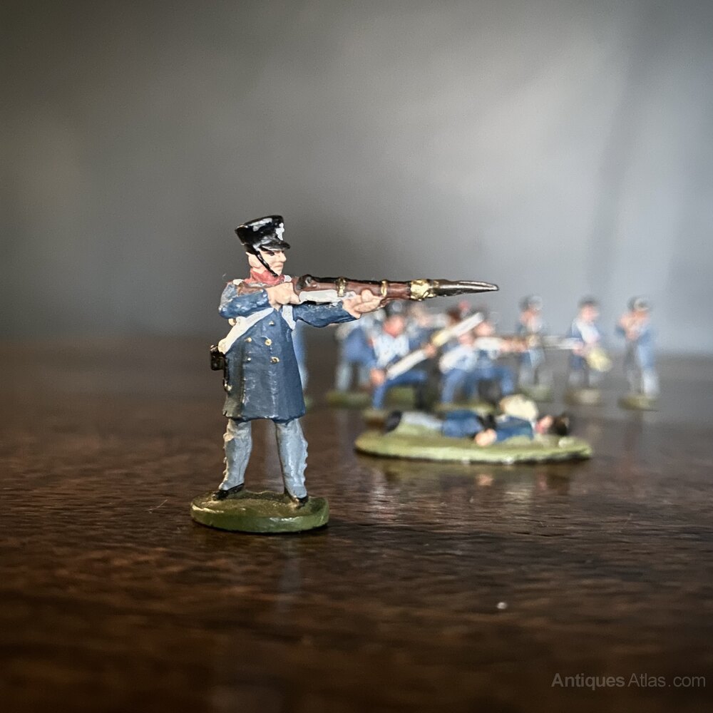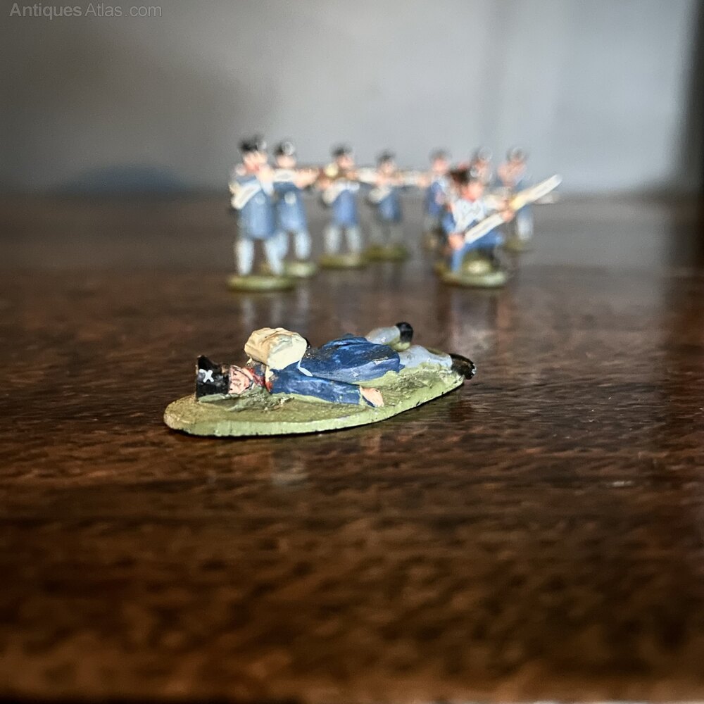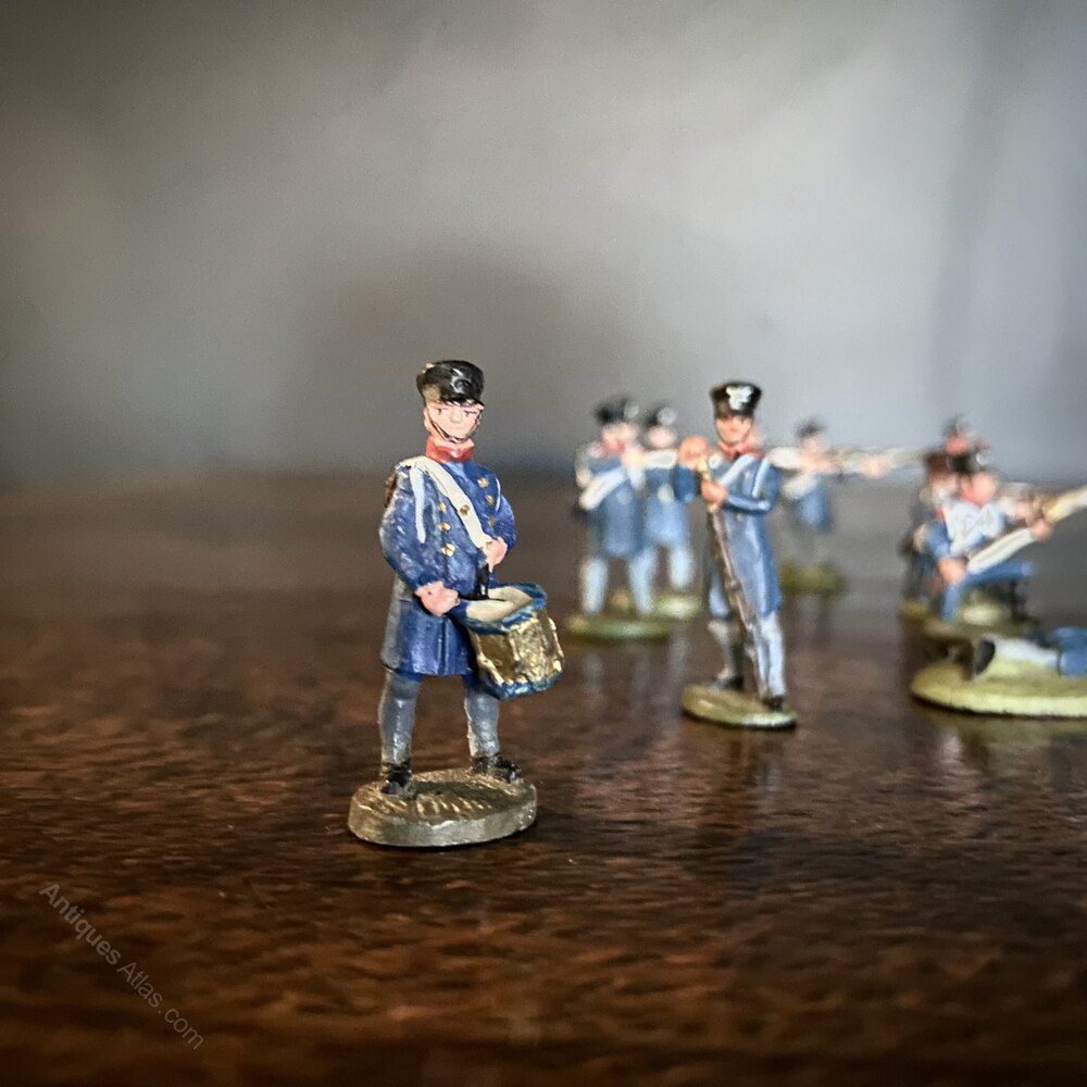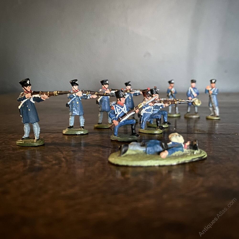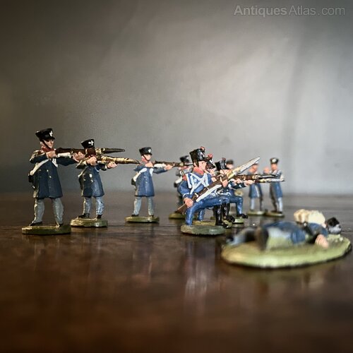 A platoon of painted lead soldiers, of the Napoleonic French Grenadier Company / Fusiliers.The set includes ten Riflemen (four stood taking aim, with three kneeling in front, one wounded, and two standing at ease), and a drummer. The soldiers are wearing the standard fusilier blue uniform with shako helmets, white banding details and light blue trousers. An ideal display piece for a shelf, desk or side table.