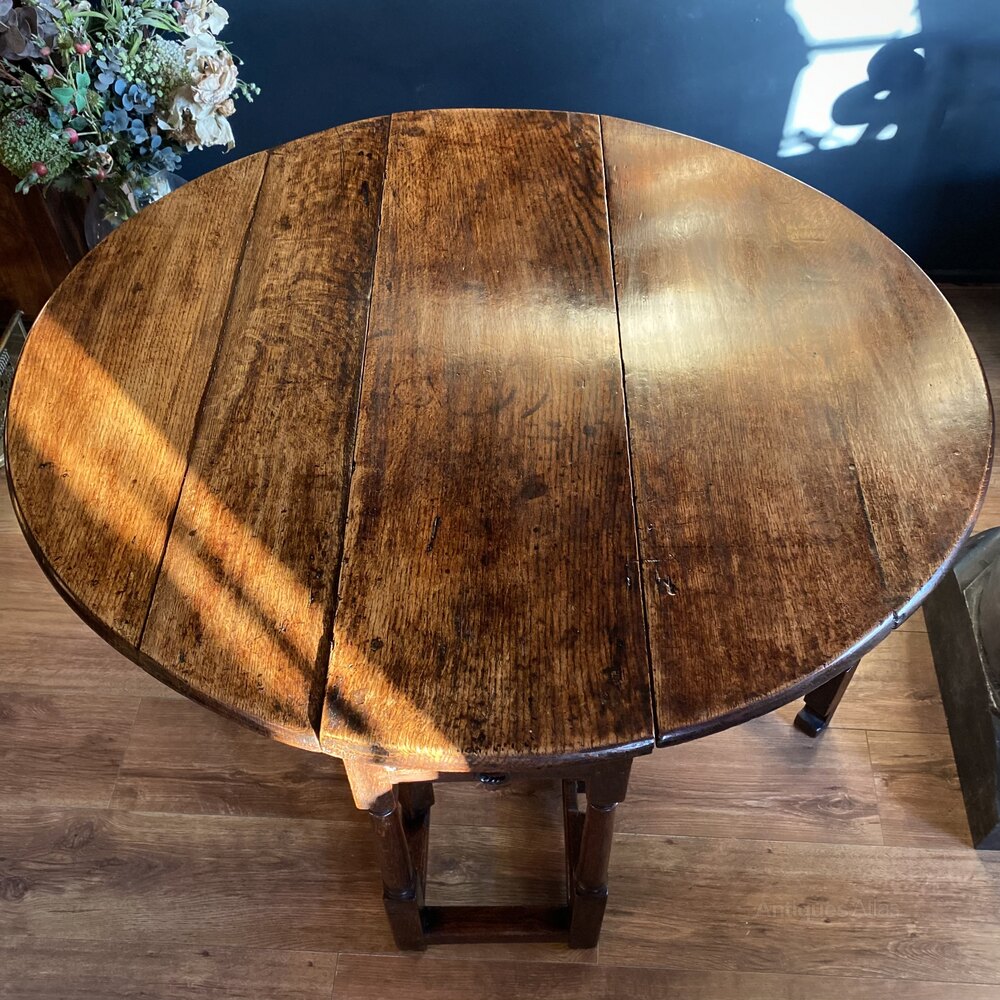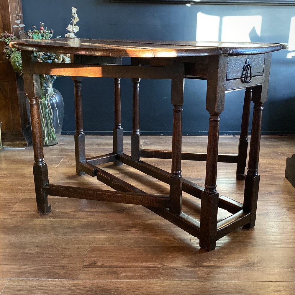 A superb English oak gateleg dining table, circa 1670.This wonderful English oak gateleg dining table is in excellent patinated condition throughout, commensurate with age. The semi-circular drop leaf sections and central top are situated over classic turned legs and block feet. A small, yet deep pull out drawer is at one side of the table and features a central iron teardrop style handle.