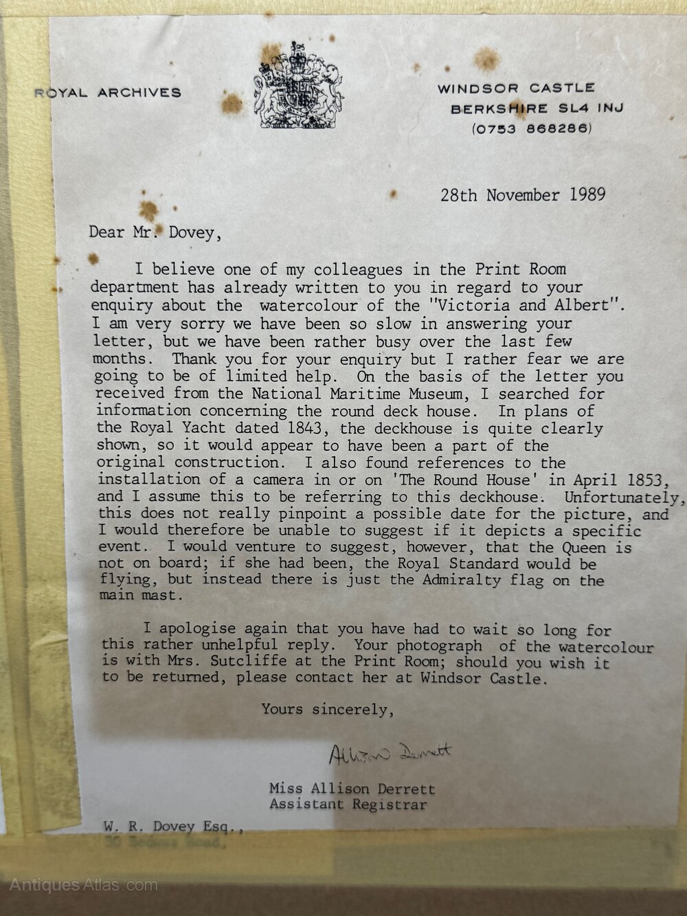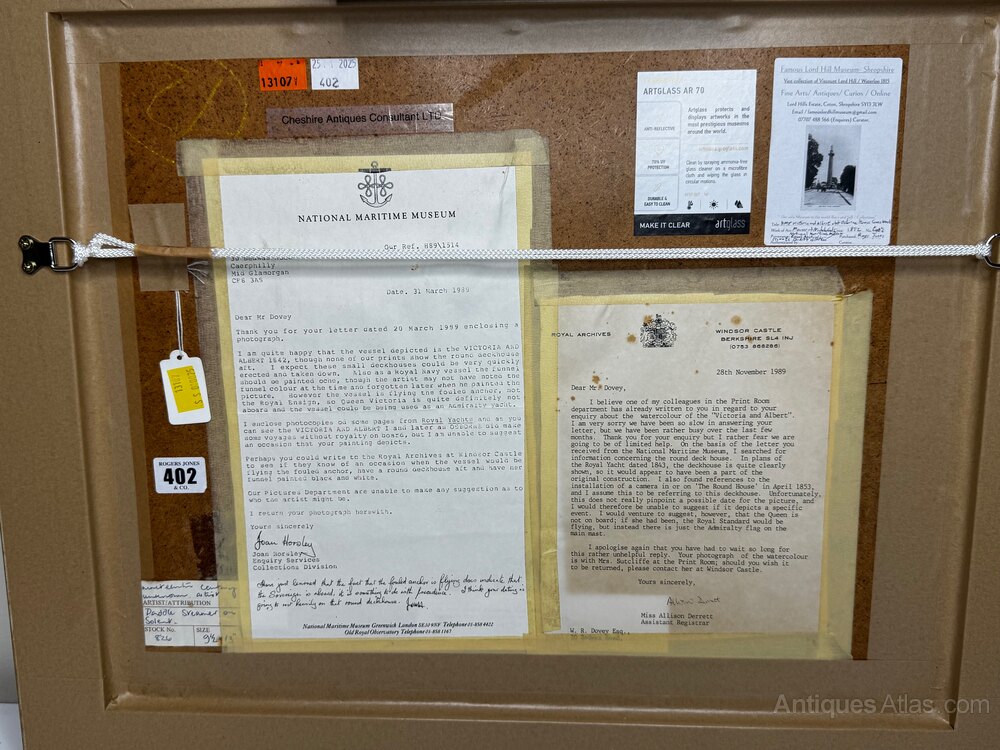 Mounted to the reverse are original letters from the National Maritime Museum, Greenwich, and the Royal Archives, Windsor Castle (both dated 1989). These confirm the identification of the vessel as HMY Victoria and Albert (I), discuss details such as the round deckhouse aft and the funnel, and explain the significance of the Admiralty flag and absence of the Royal Standard. For a privately owned Victorian watercolour, this level of institutional confirmation is unusual and greatly strengthens the historical interest of the piece.